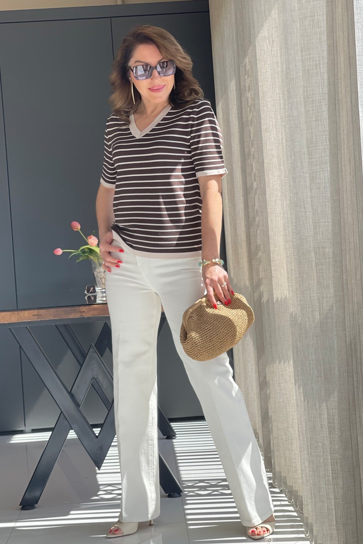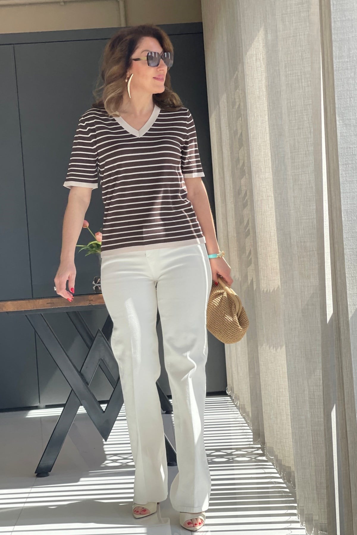Bej Çizgi Cappuccıno Triko Bluz Haki Çizgi Bej Triko Bluz Mavi Çizgi Cappuccıno Triko Bluz