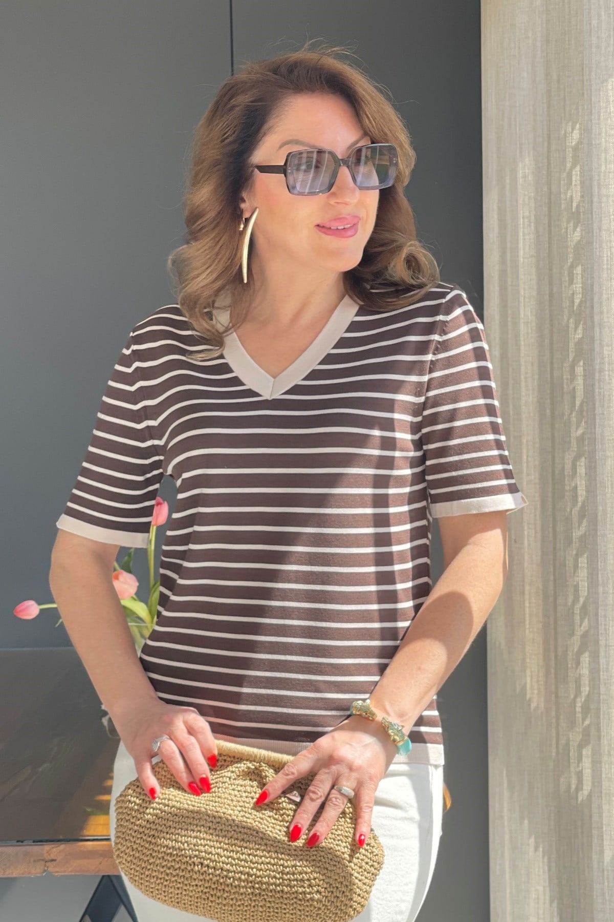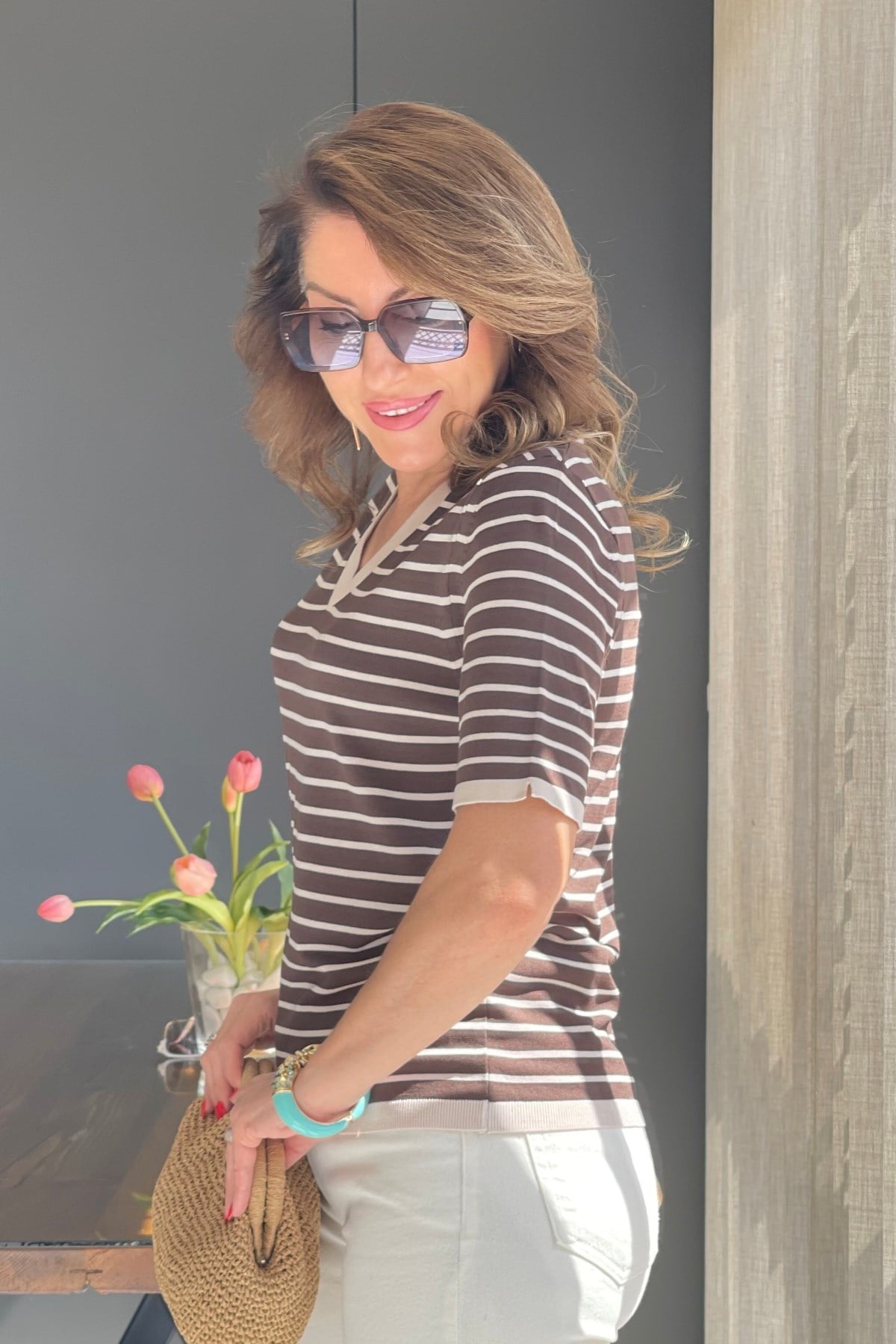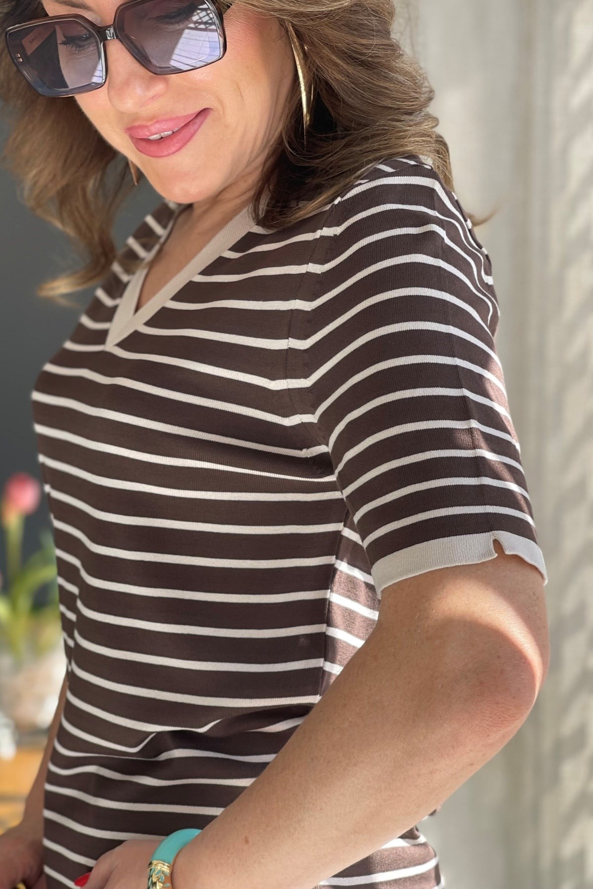 Bej Çizgi Kahve Triko Bluz (Mislina-1865)