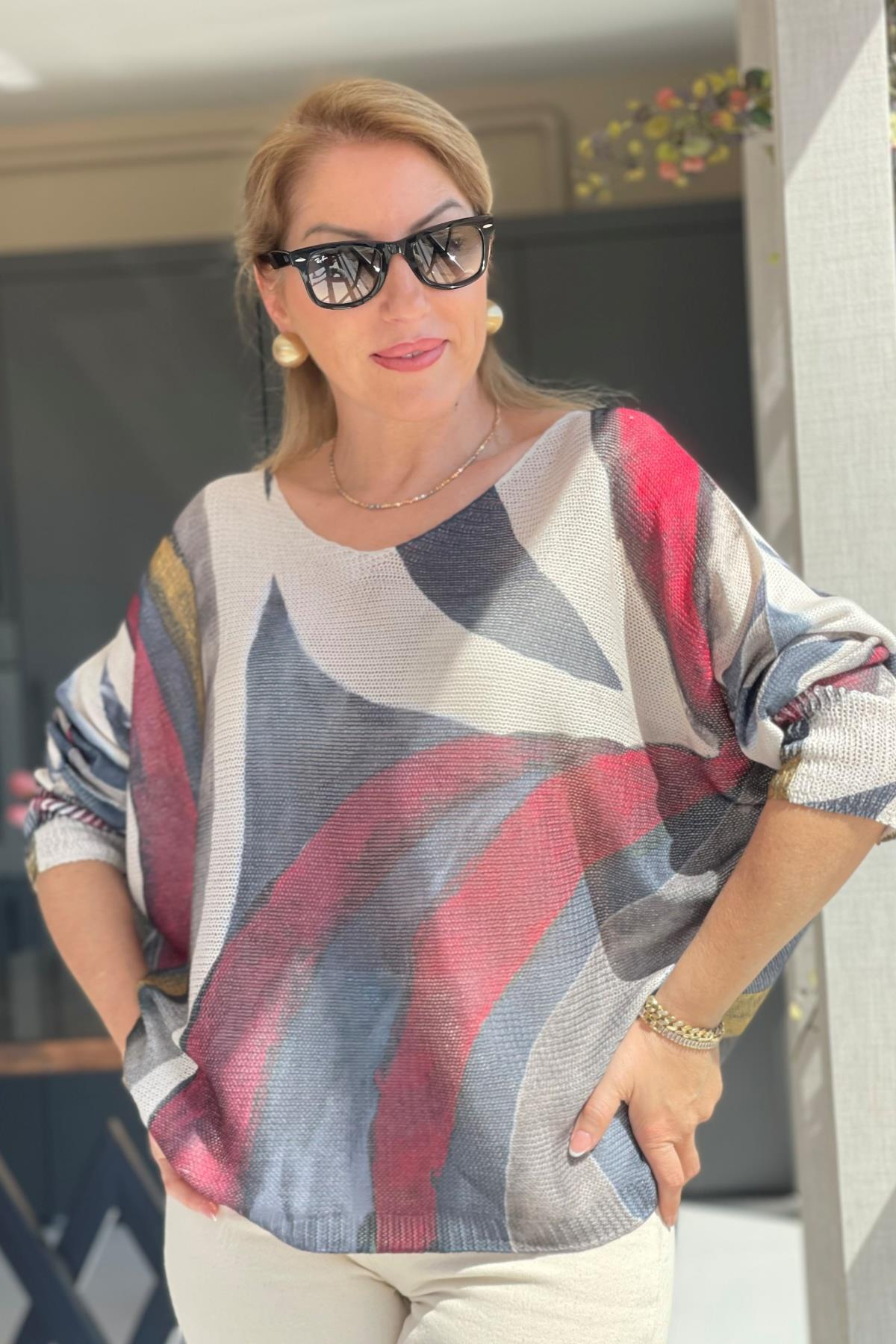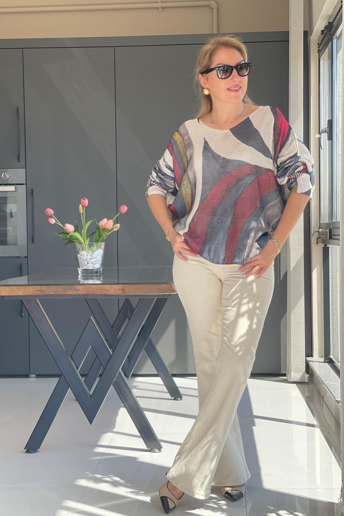 Bej Karışık Model Triko Bluz (Mislina-1565)