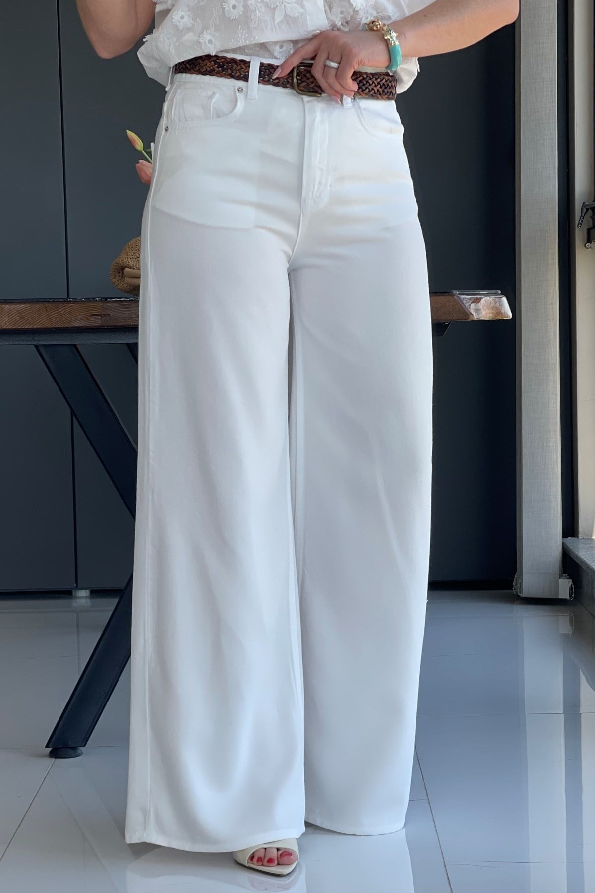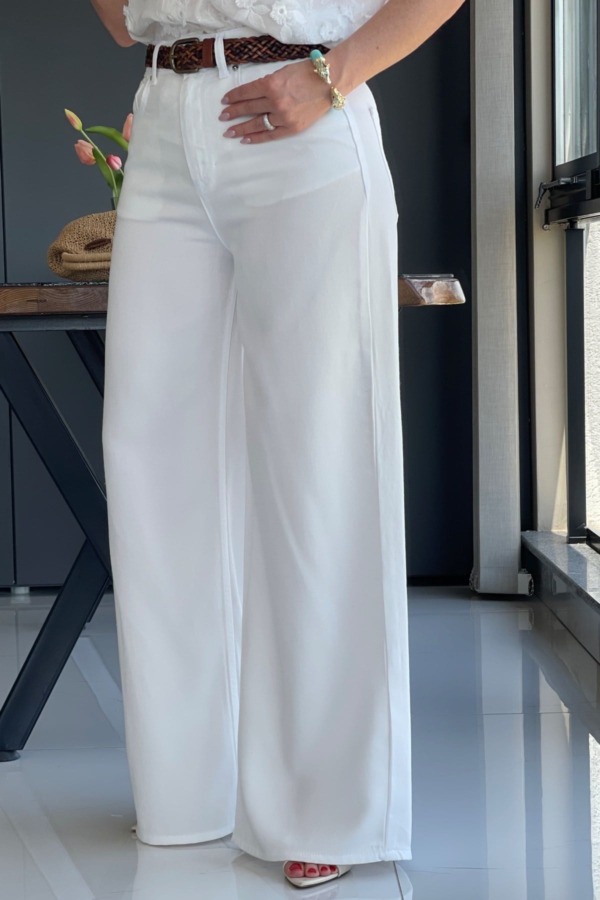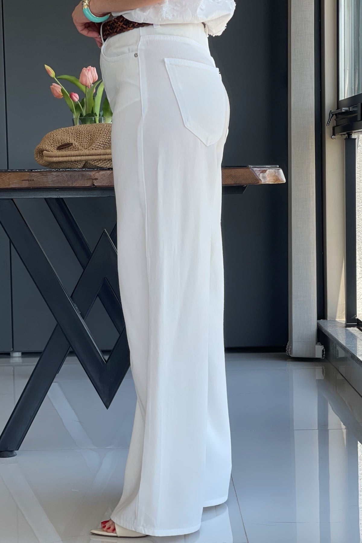 Manken üzerinde 36 beden kullanmıştır. Ürün likra yoktur. Kemer aksesuar olarak kullanılmıştır.