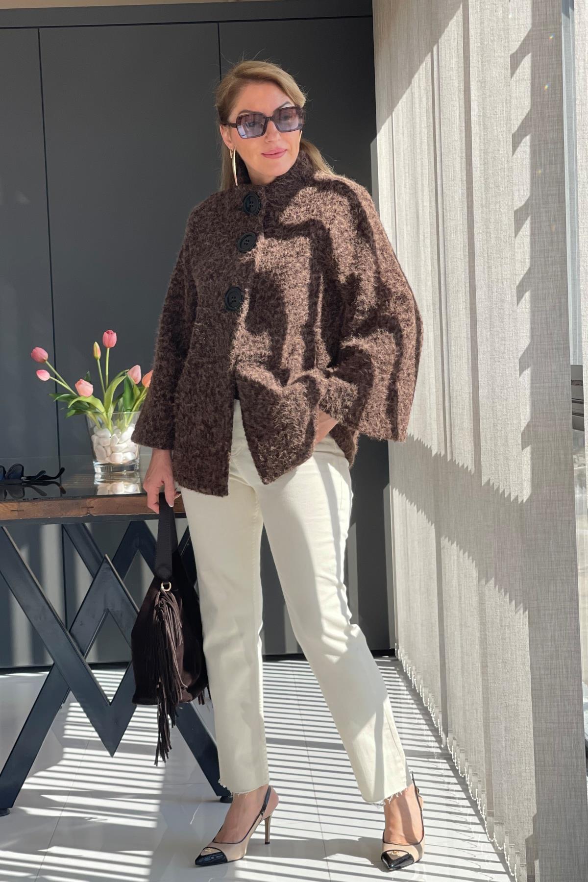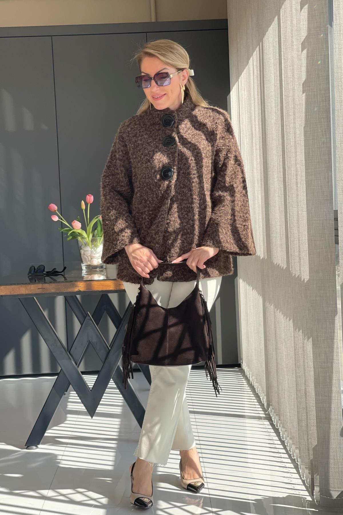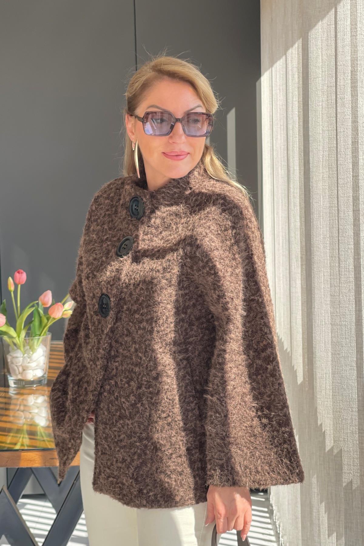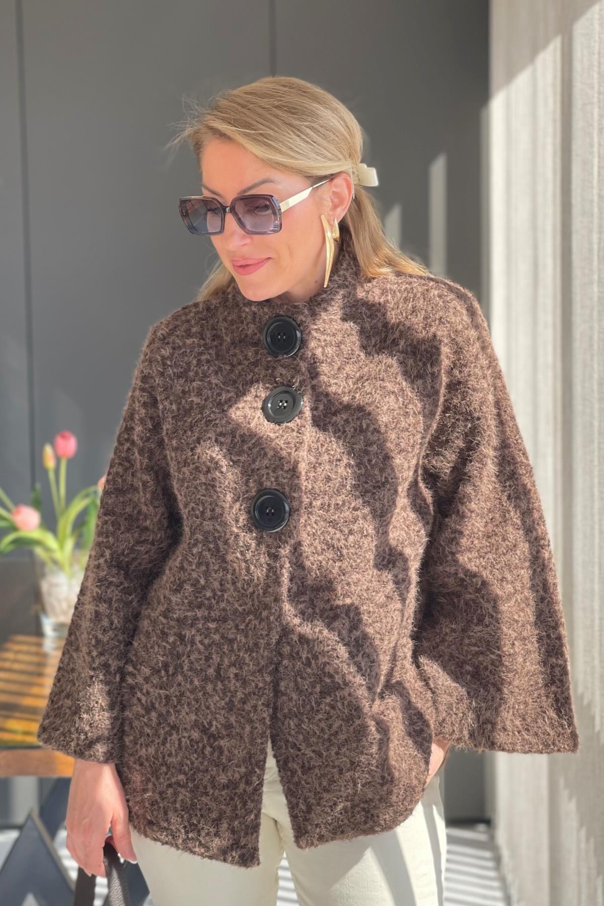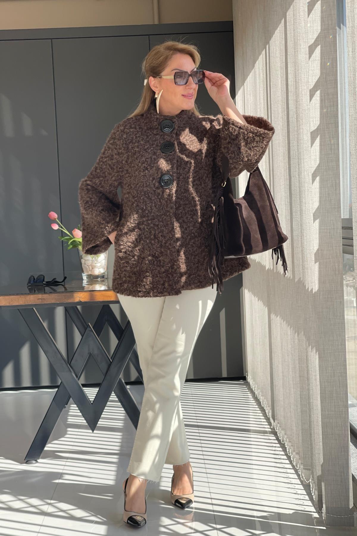 Büyük Düğme Detay Acı Kahve Keçe Kaban (Mislina-1594)