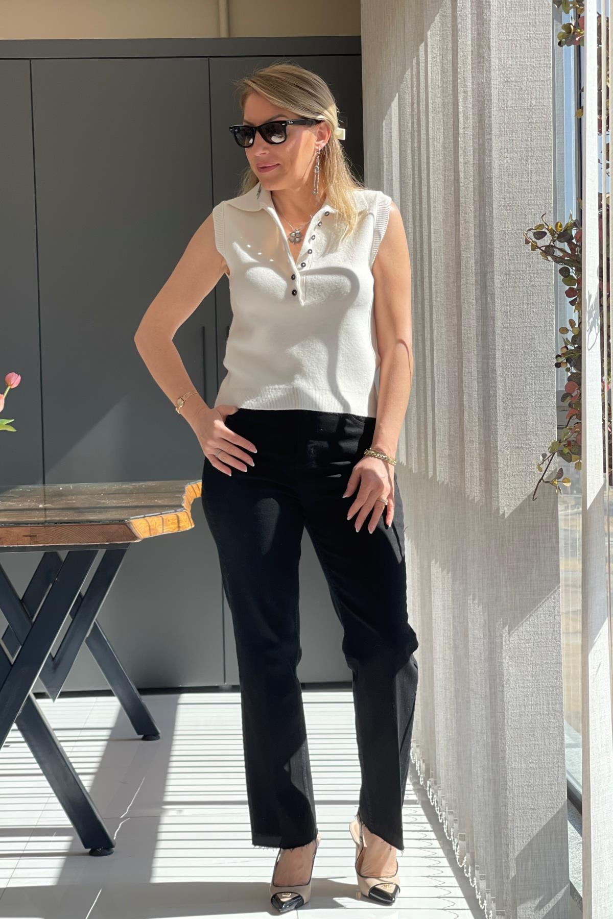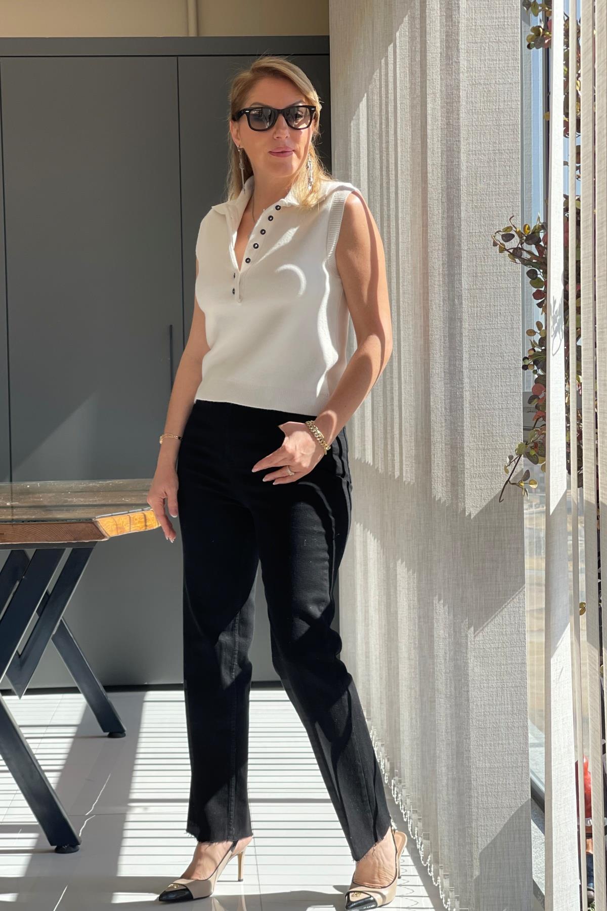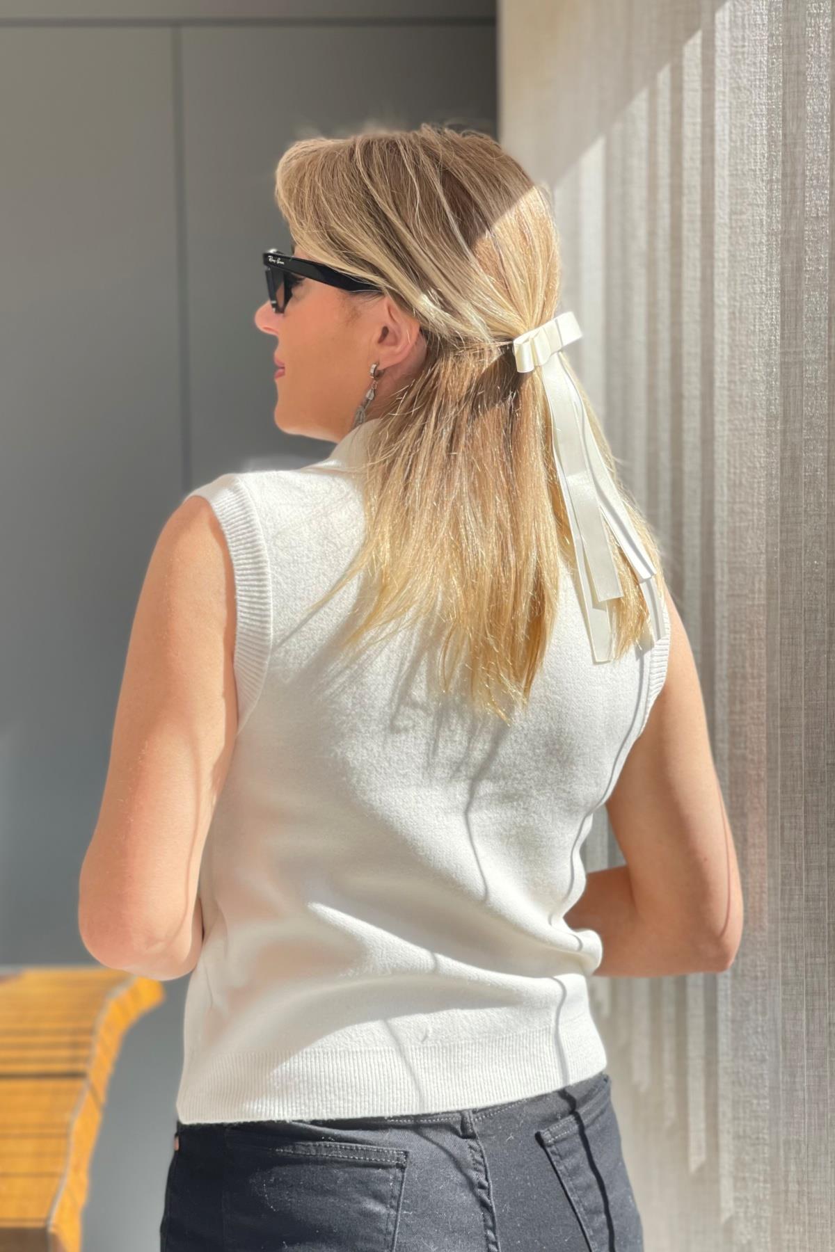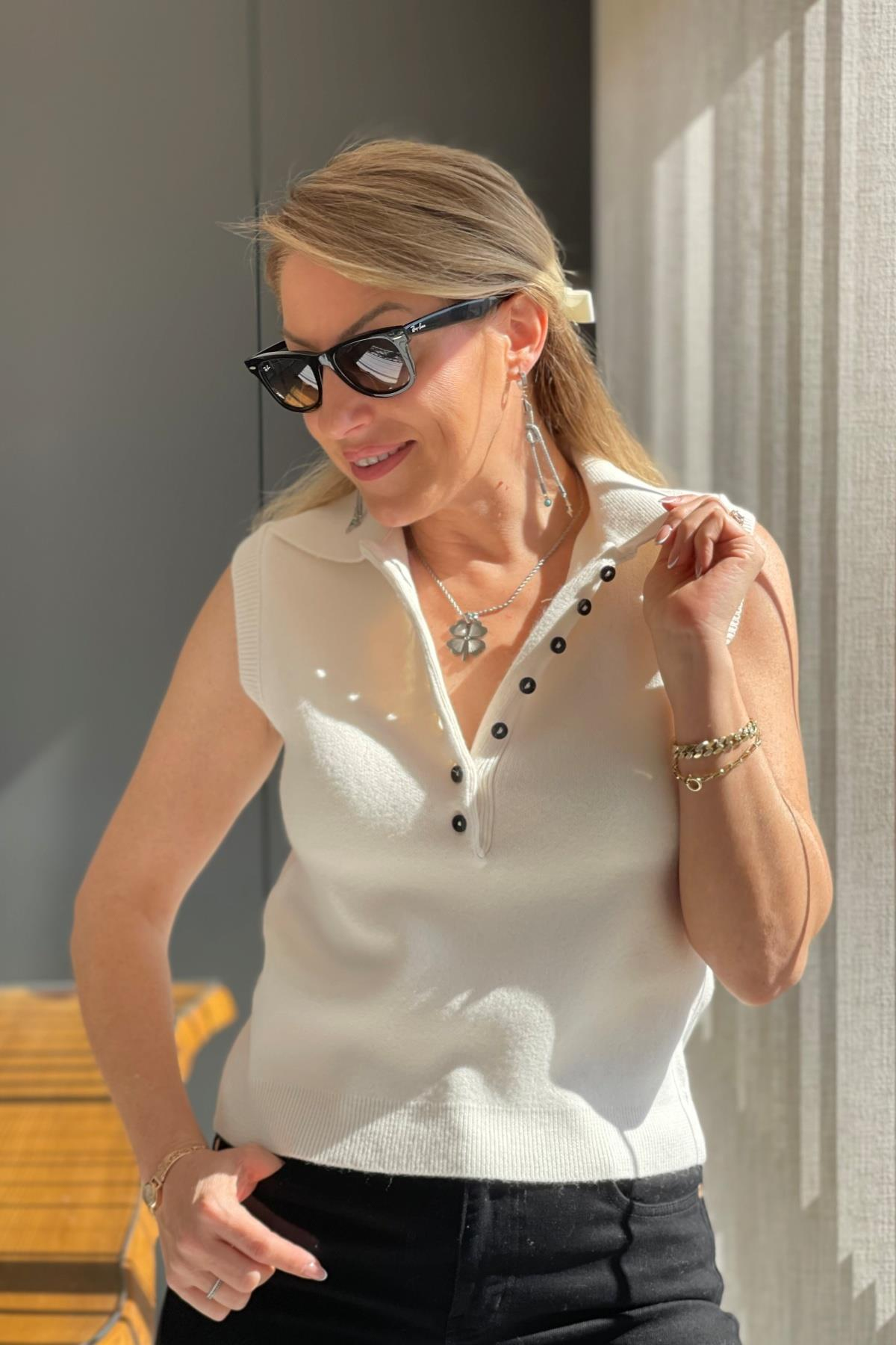 Düğme Detay Krem Kolsuz Kazak (Mislina-1574)