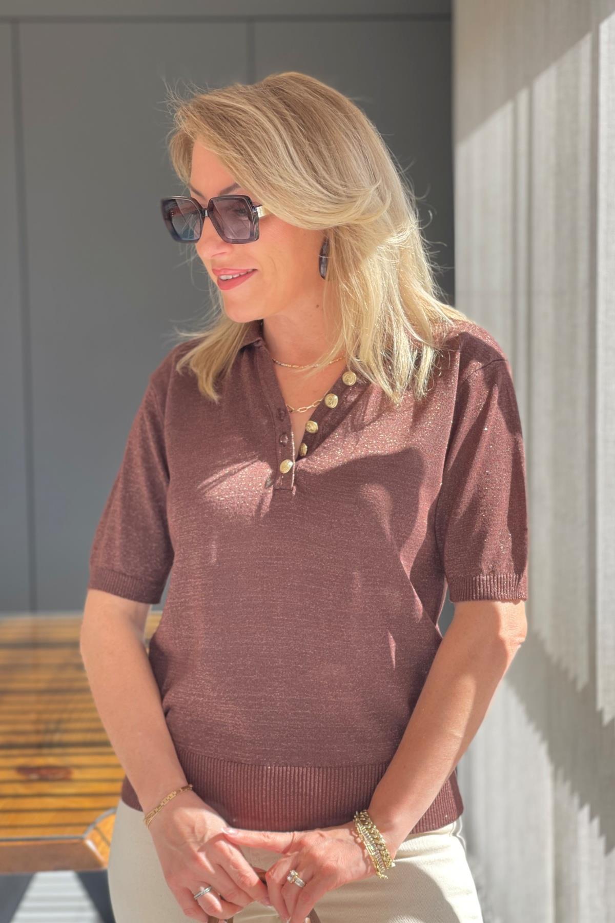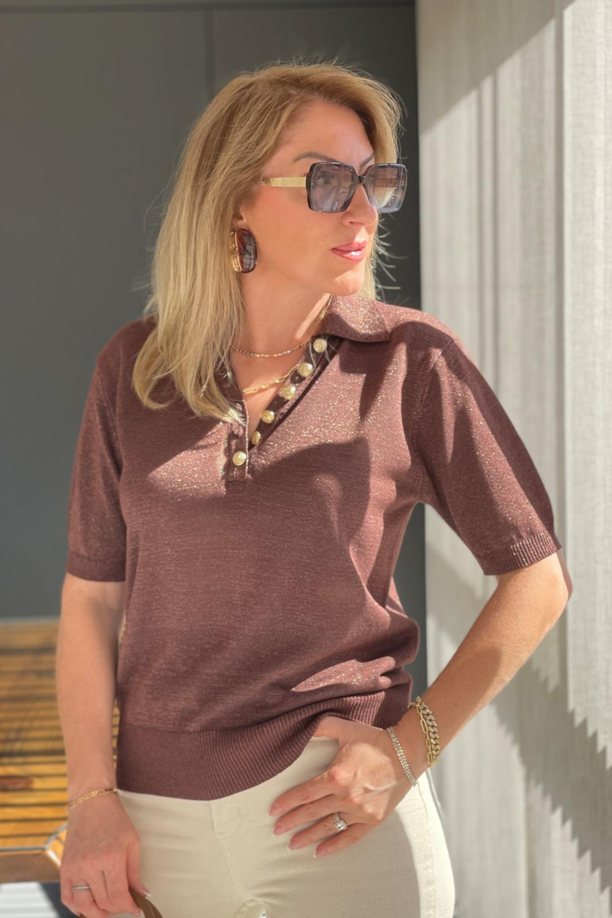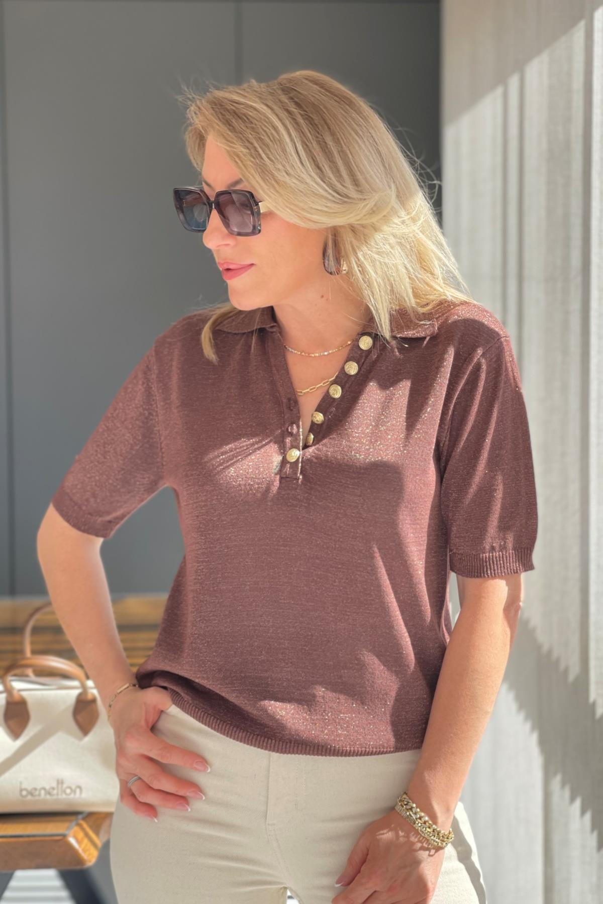 Gold Sim Yaka Detay Kahve Bluz (Mislina-1561)