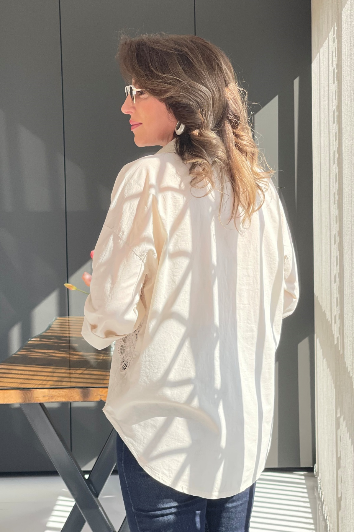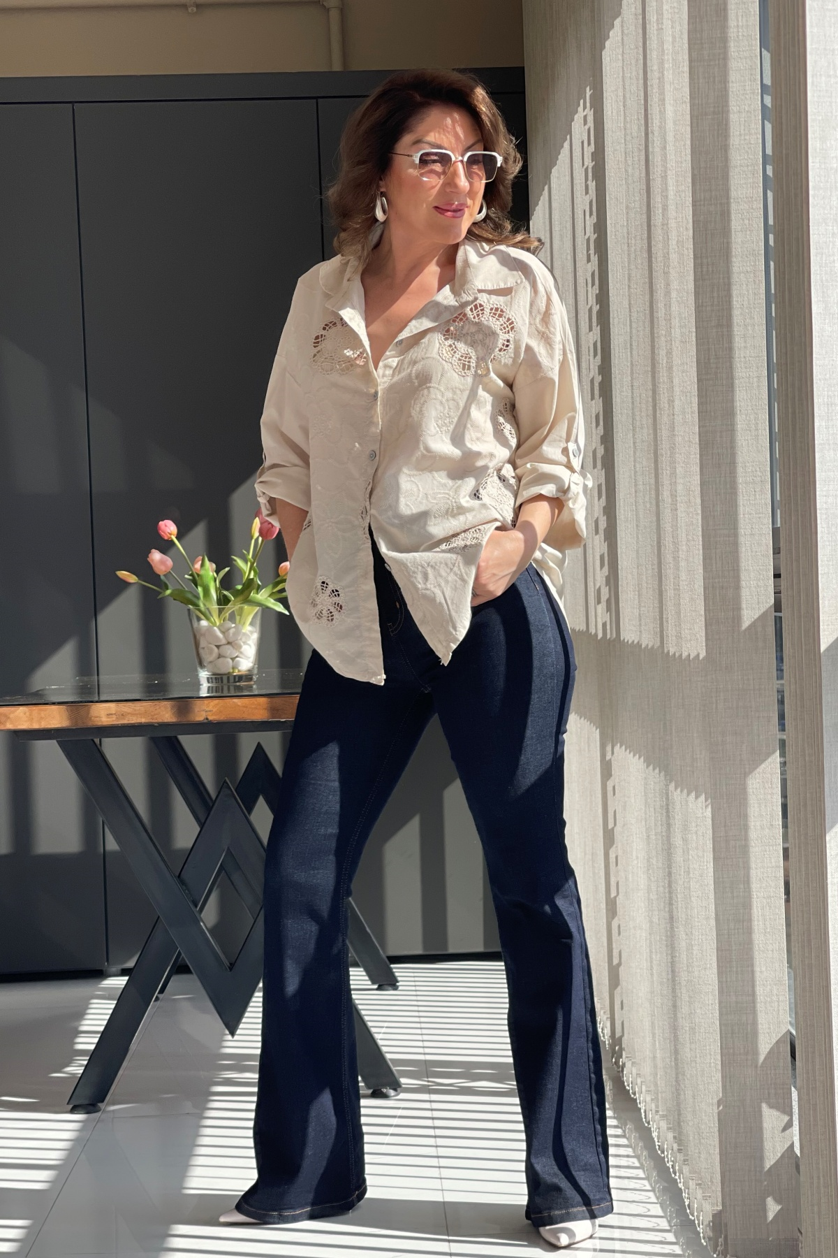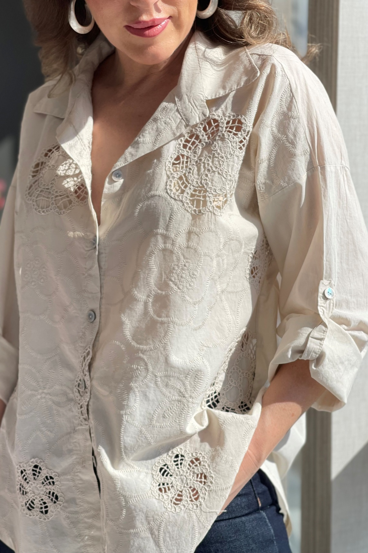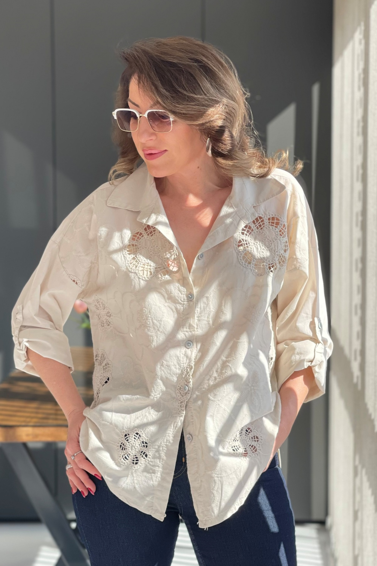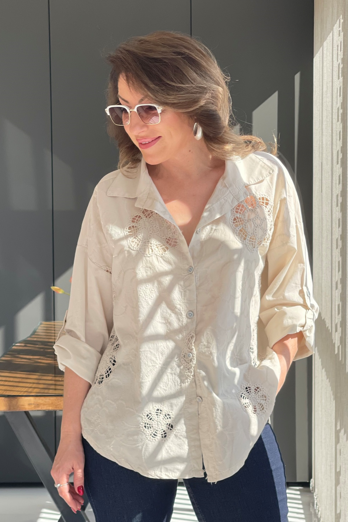 Nakış Çiçek Desen Bej Gömlek (Mislina-1800)