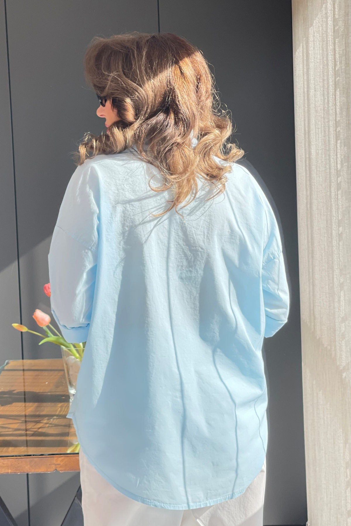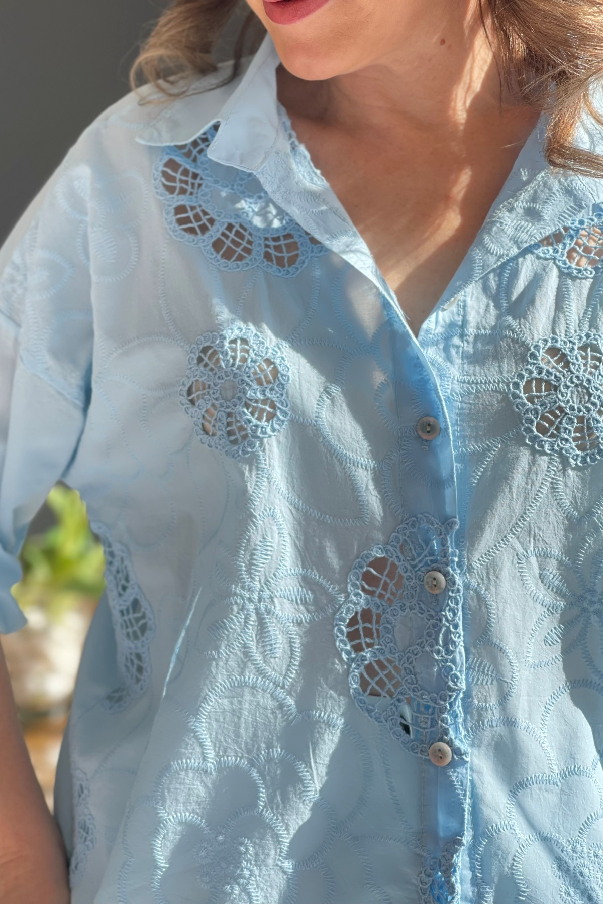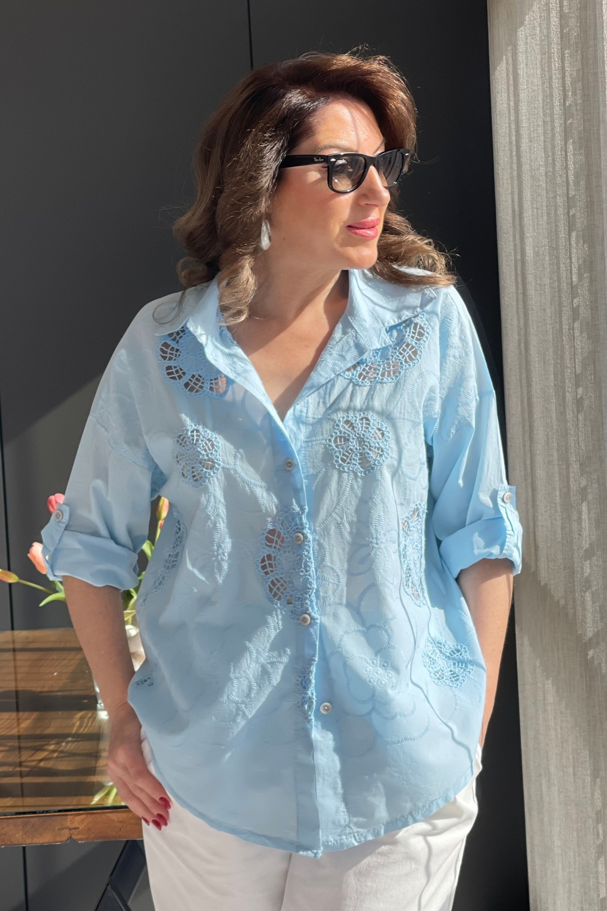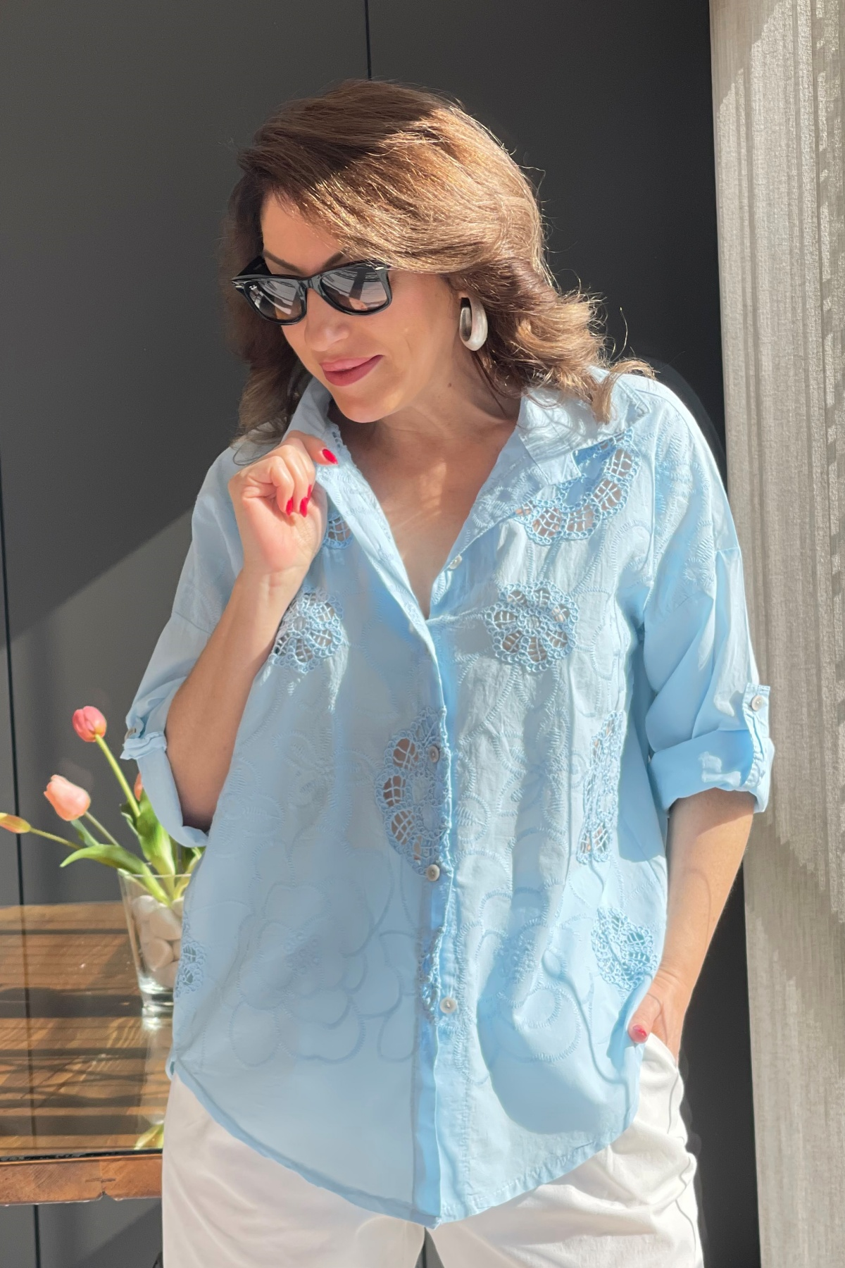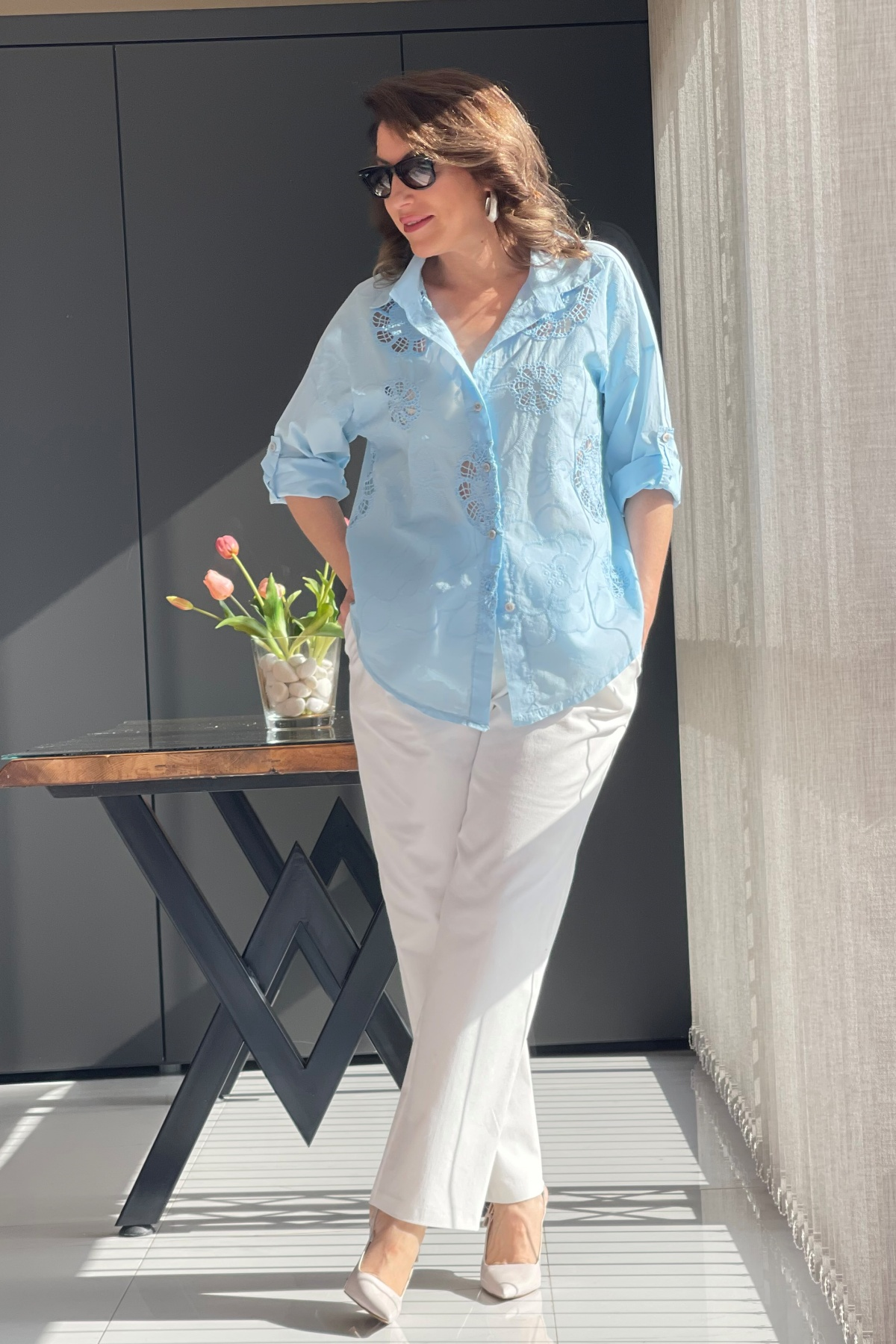 Nakış Çiçek Desen İndigo Gömlek (Mislina-1800)