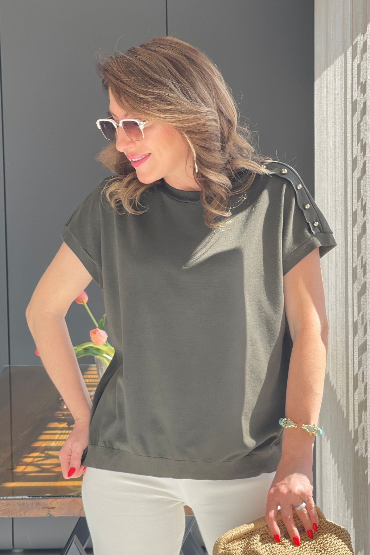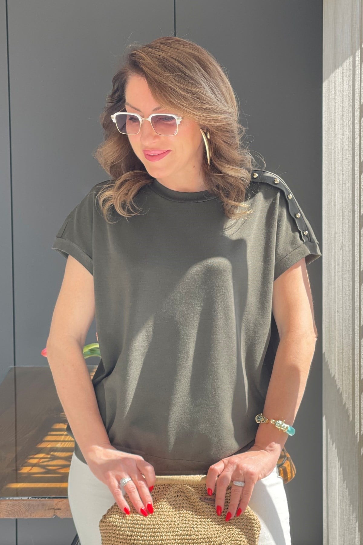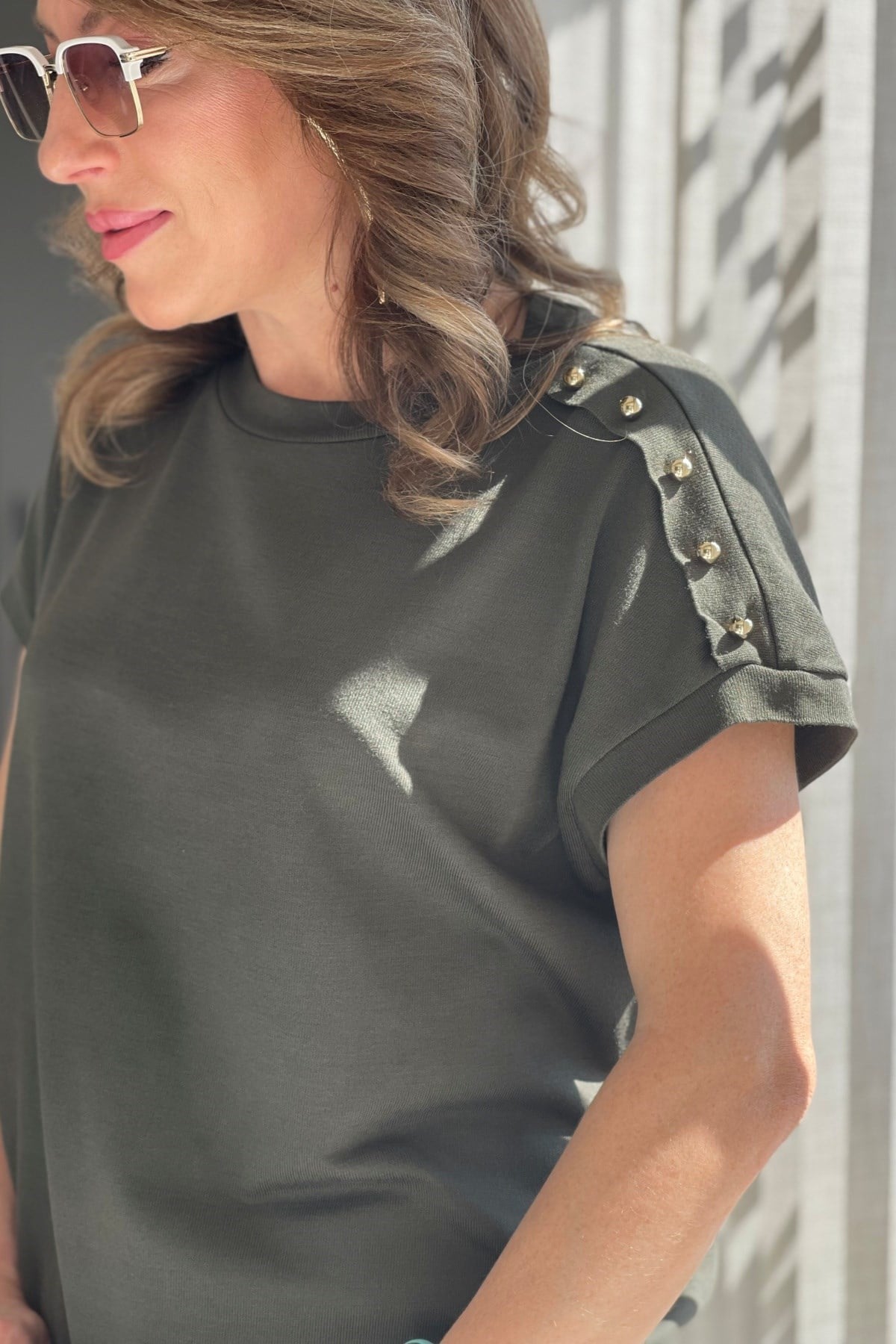 Omuz Düğme Detay Haki Bluz (Mislina-1864)