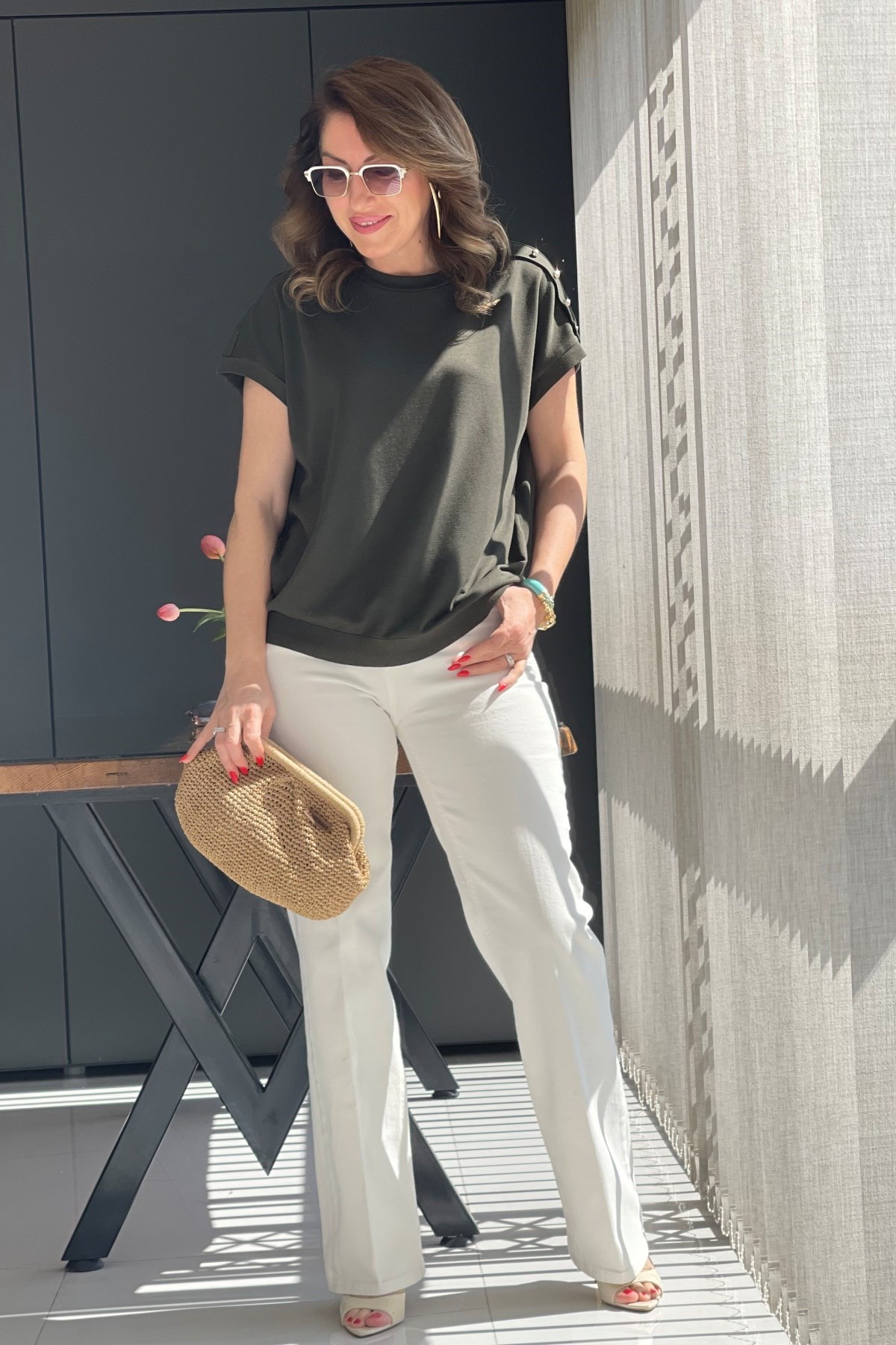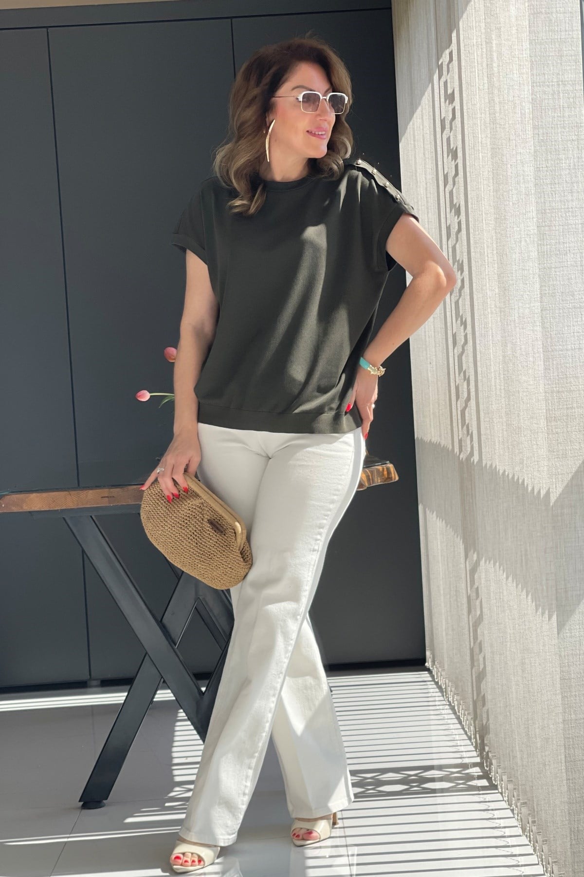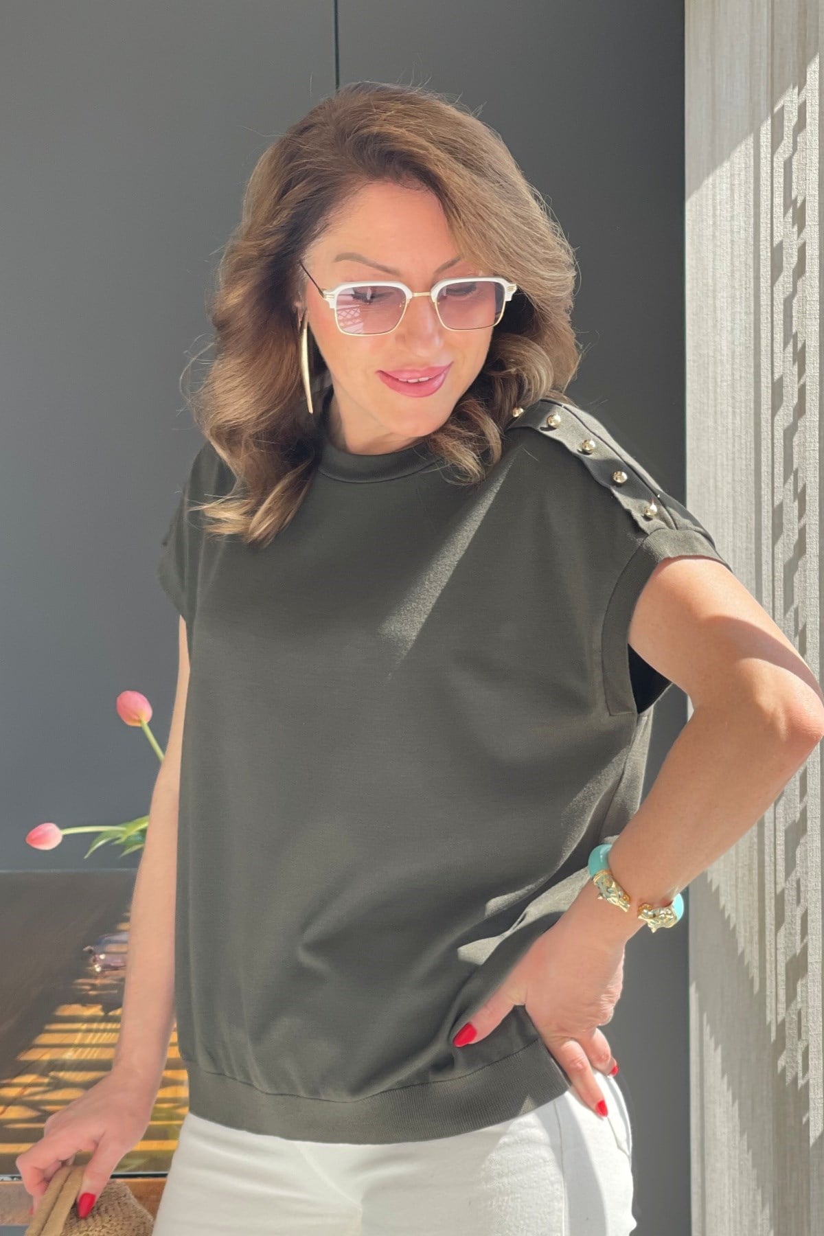 Omuz Düğme Detay Haki Bluz (Mislina-1864)
