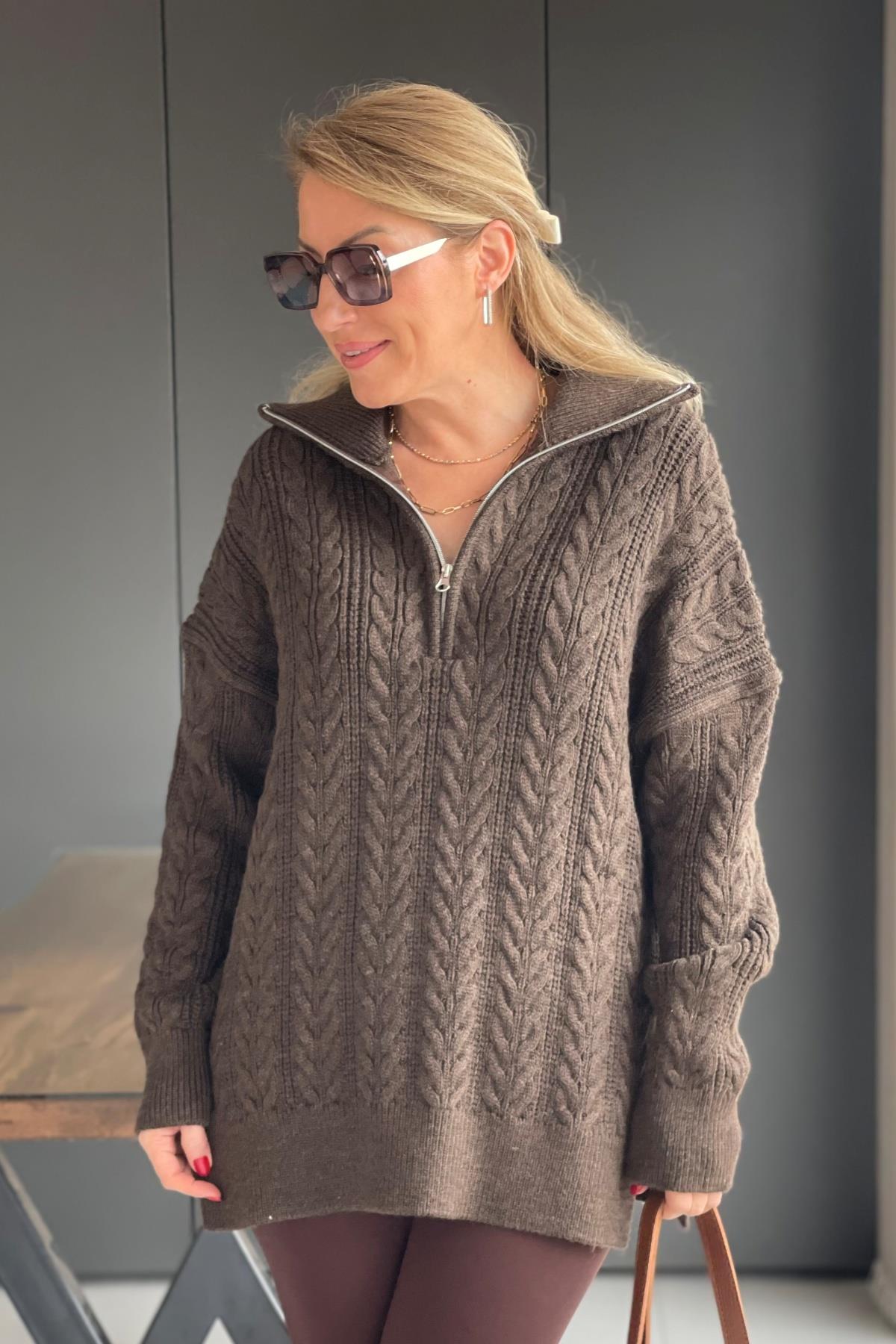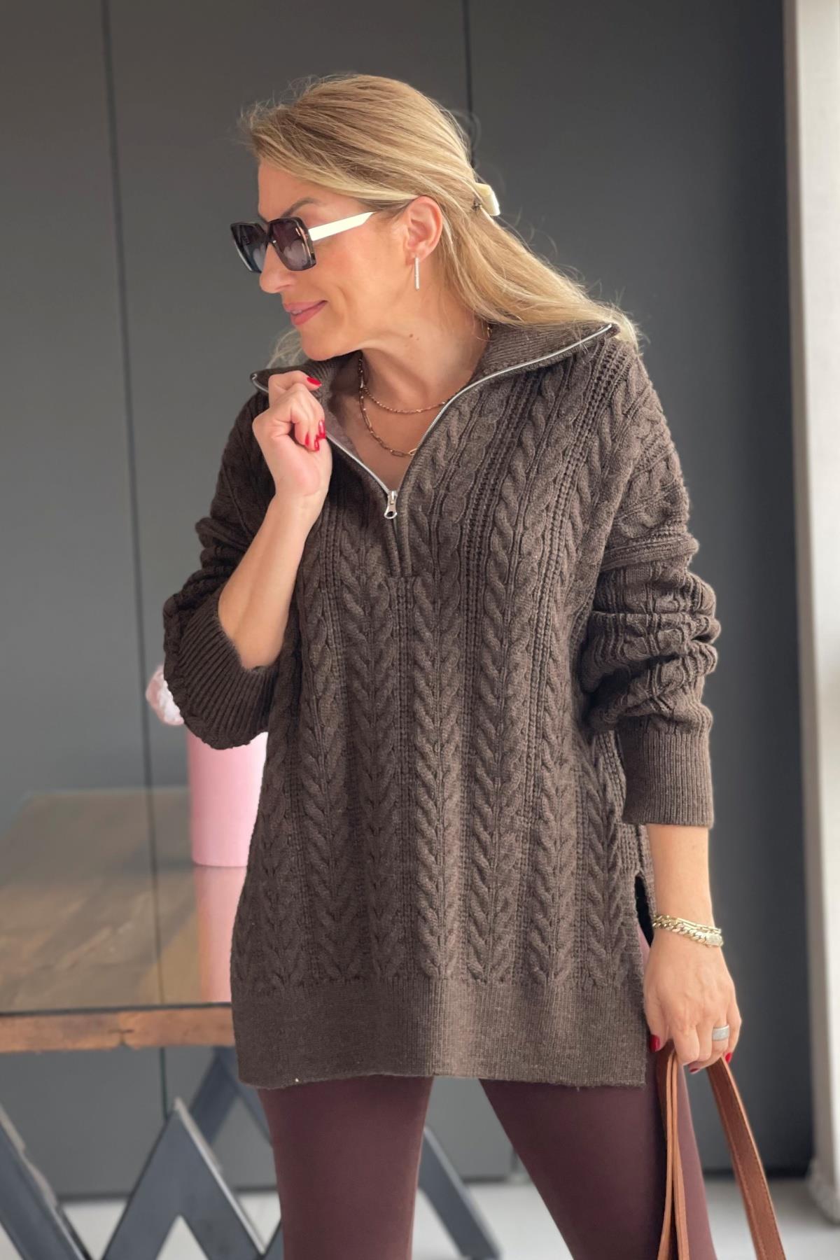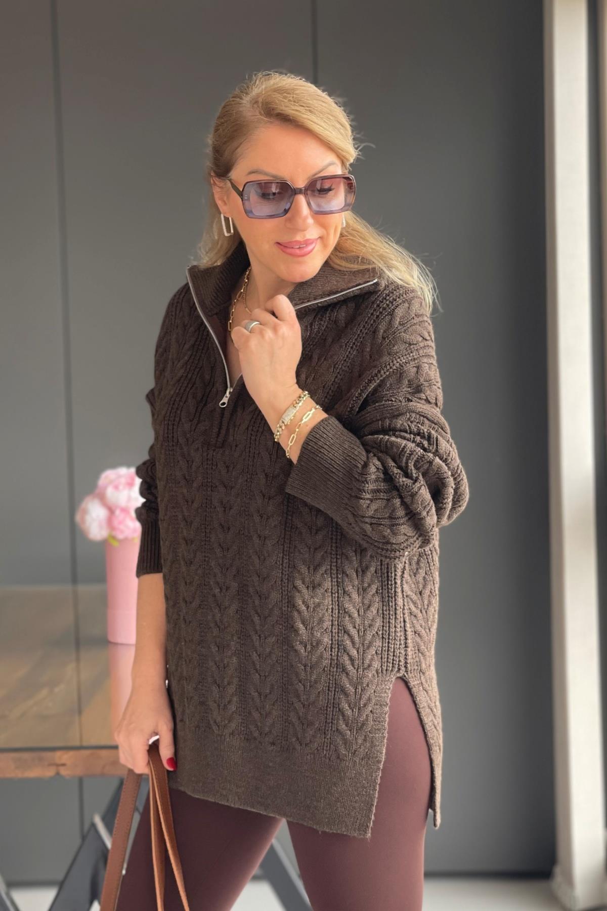 Örgü Detay Kahve Tunik Kazak (Mislina-1654)
