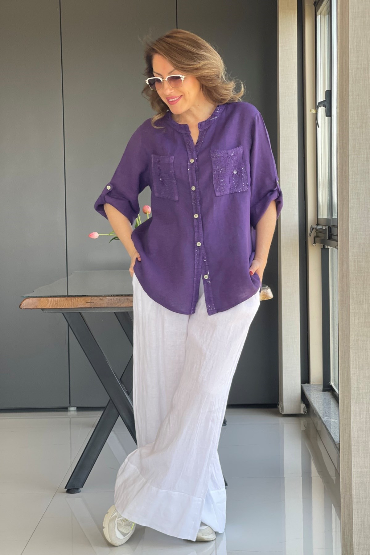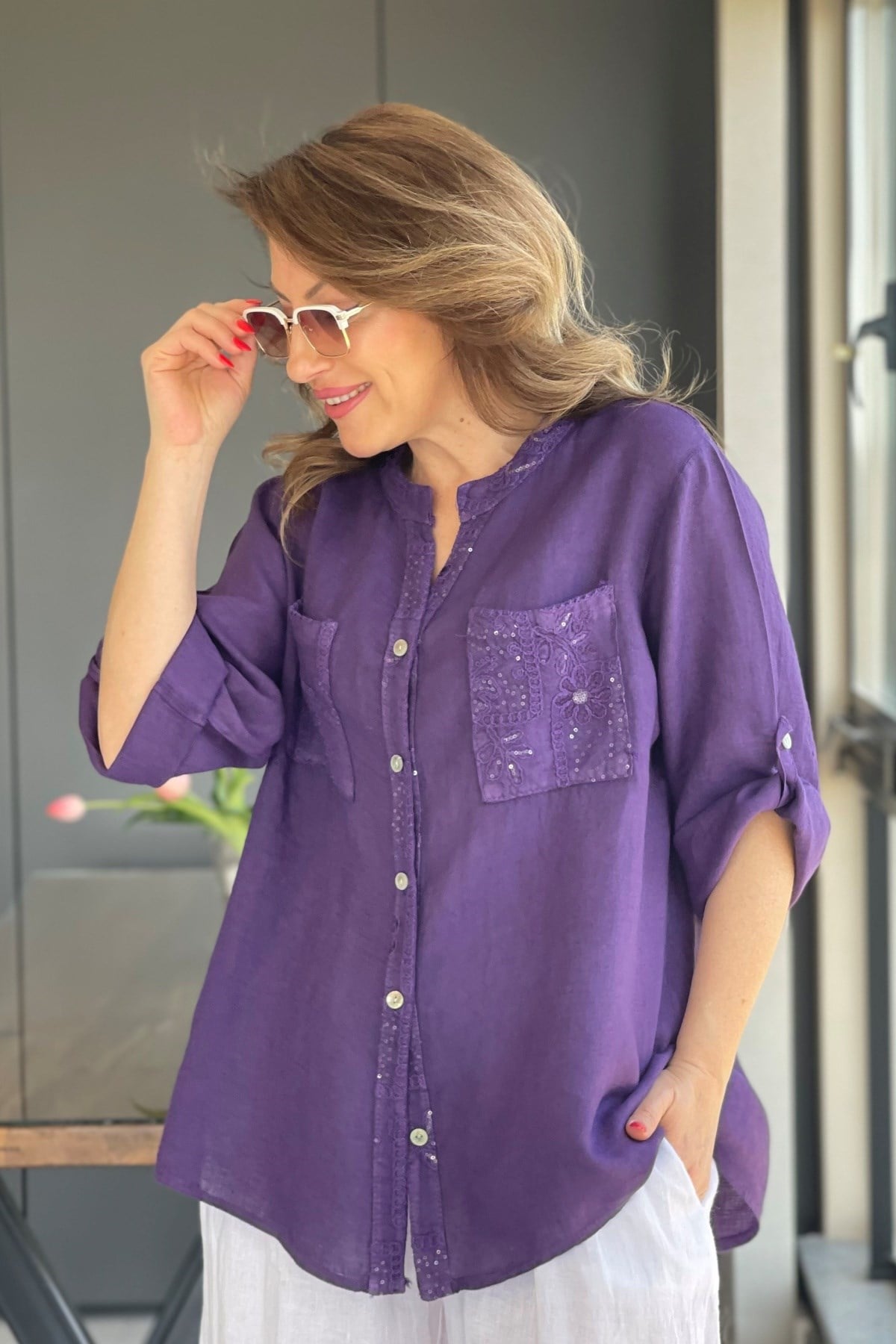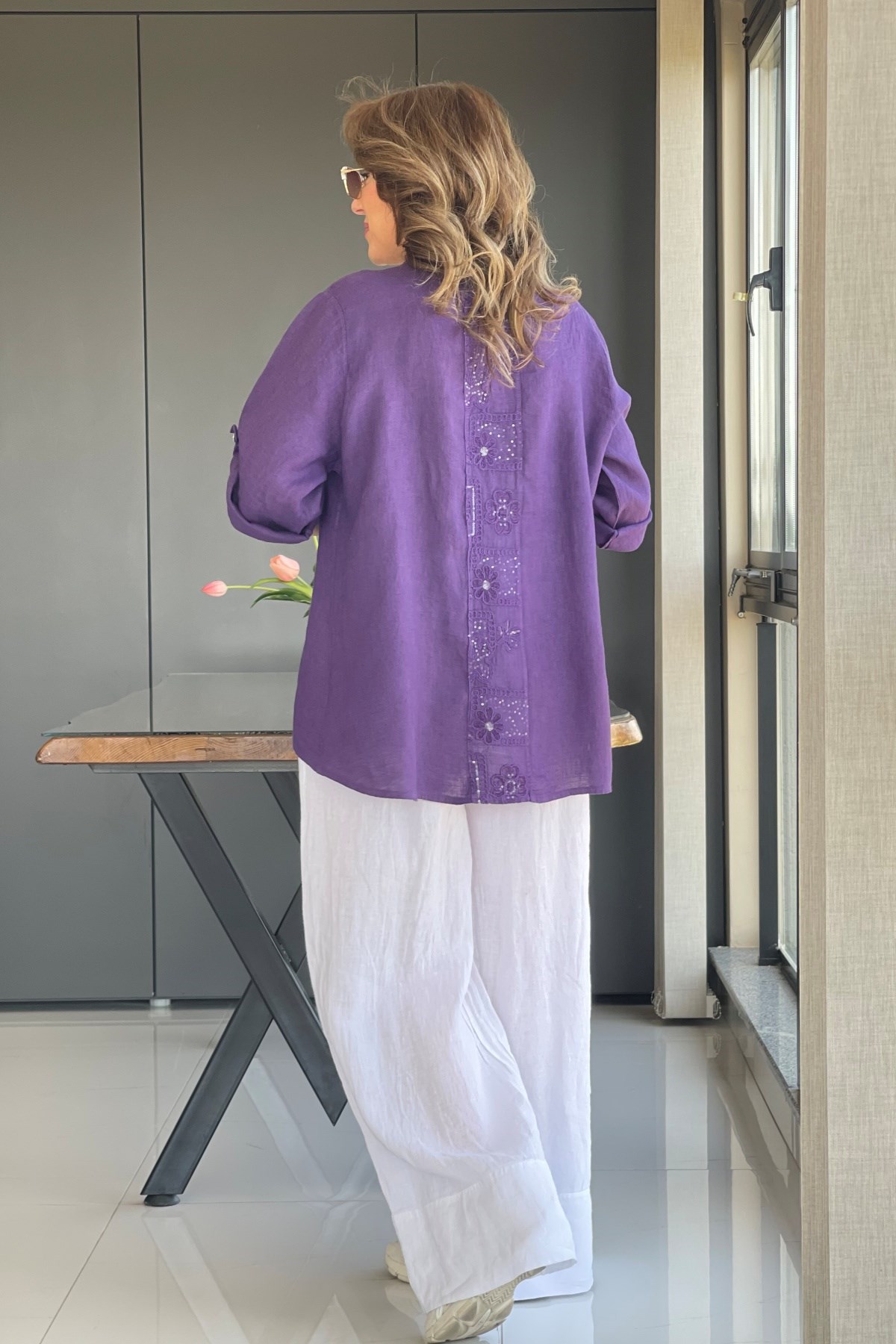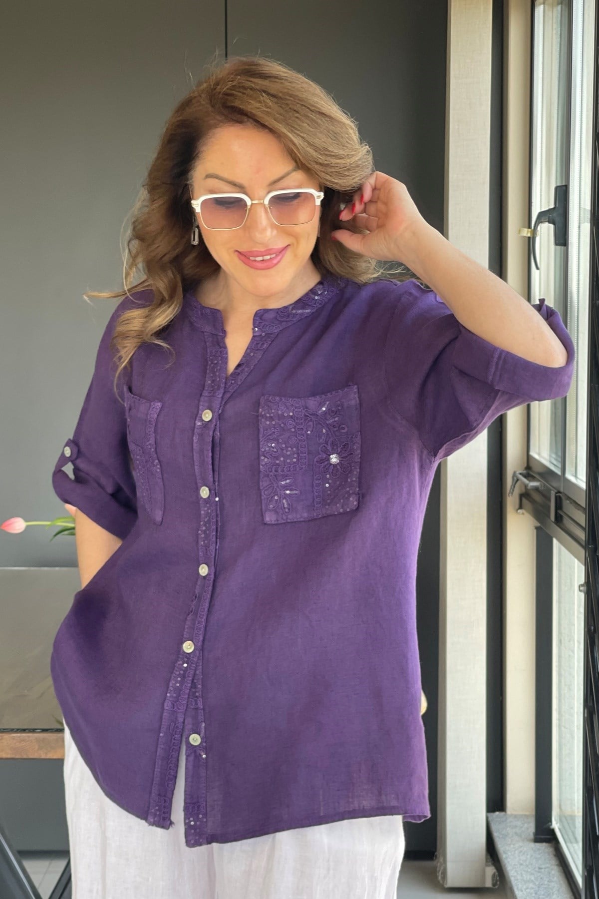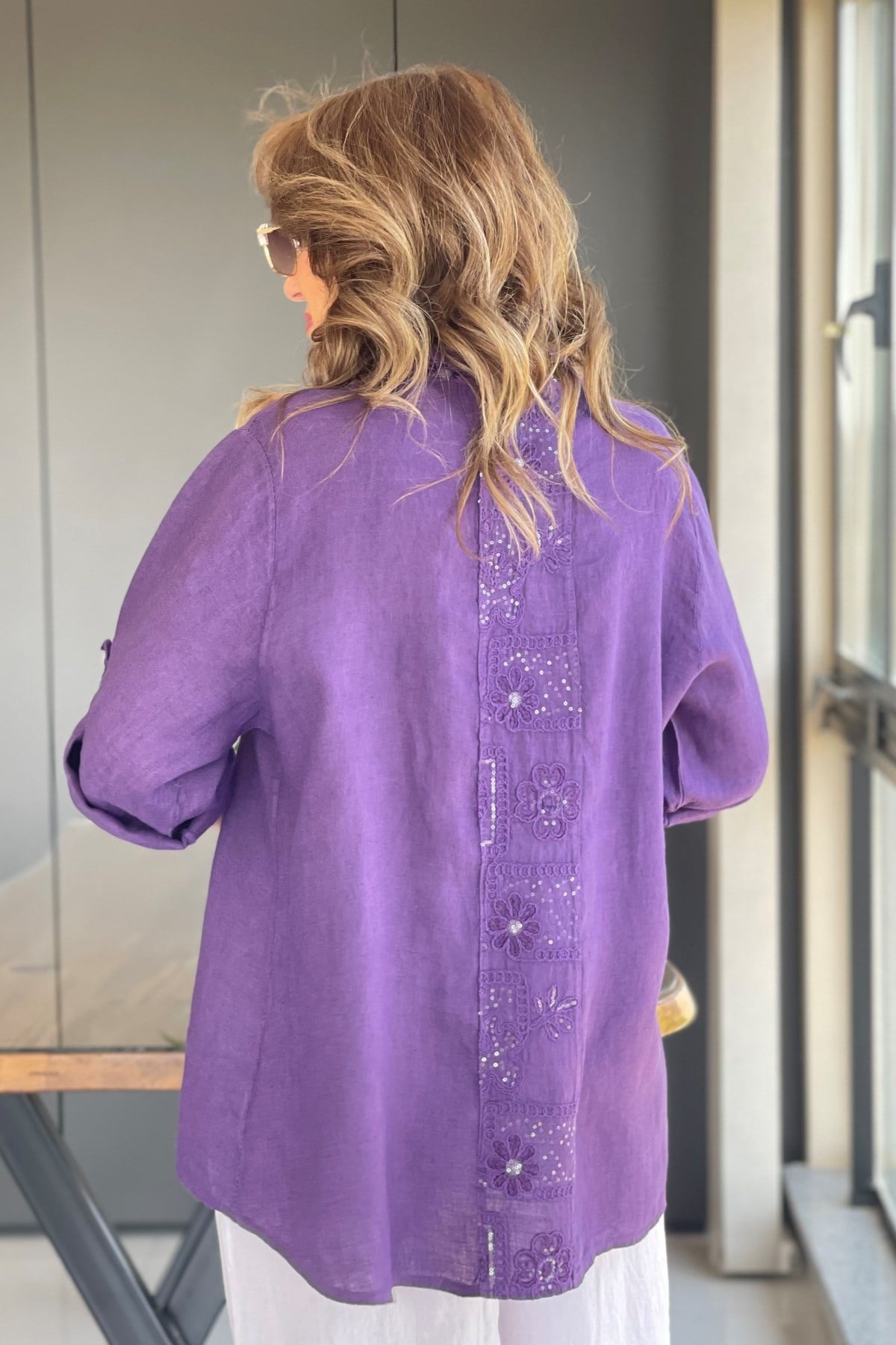 Sırt Detay İthal Keten Mor Gömlek (Mislina-1879)