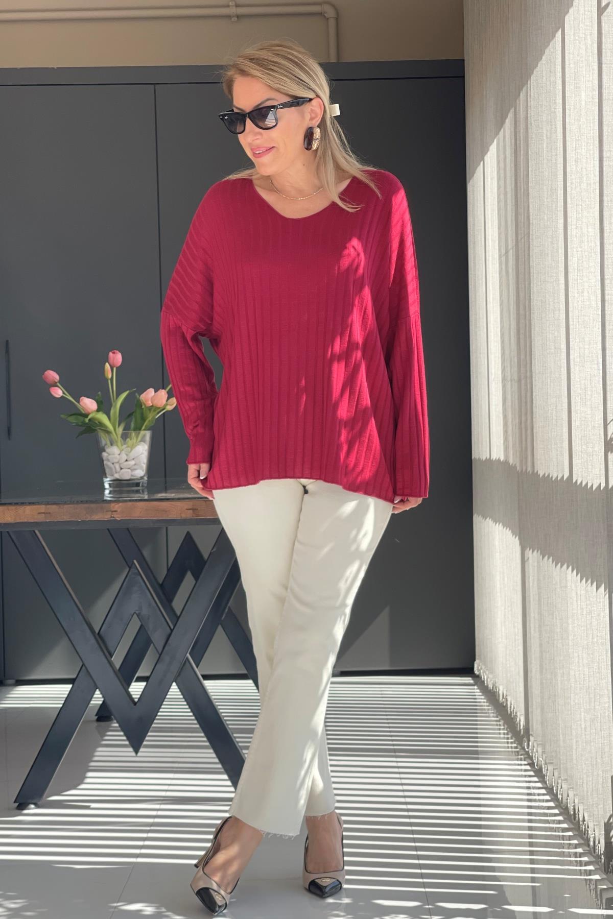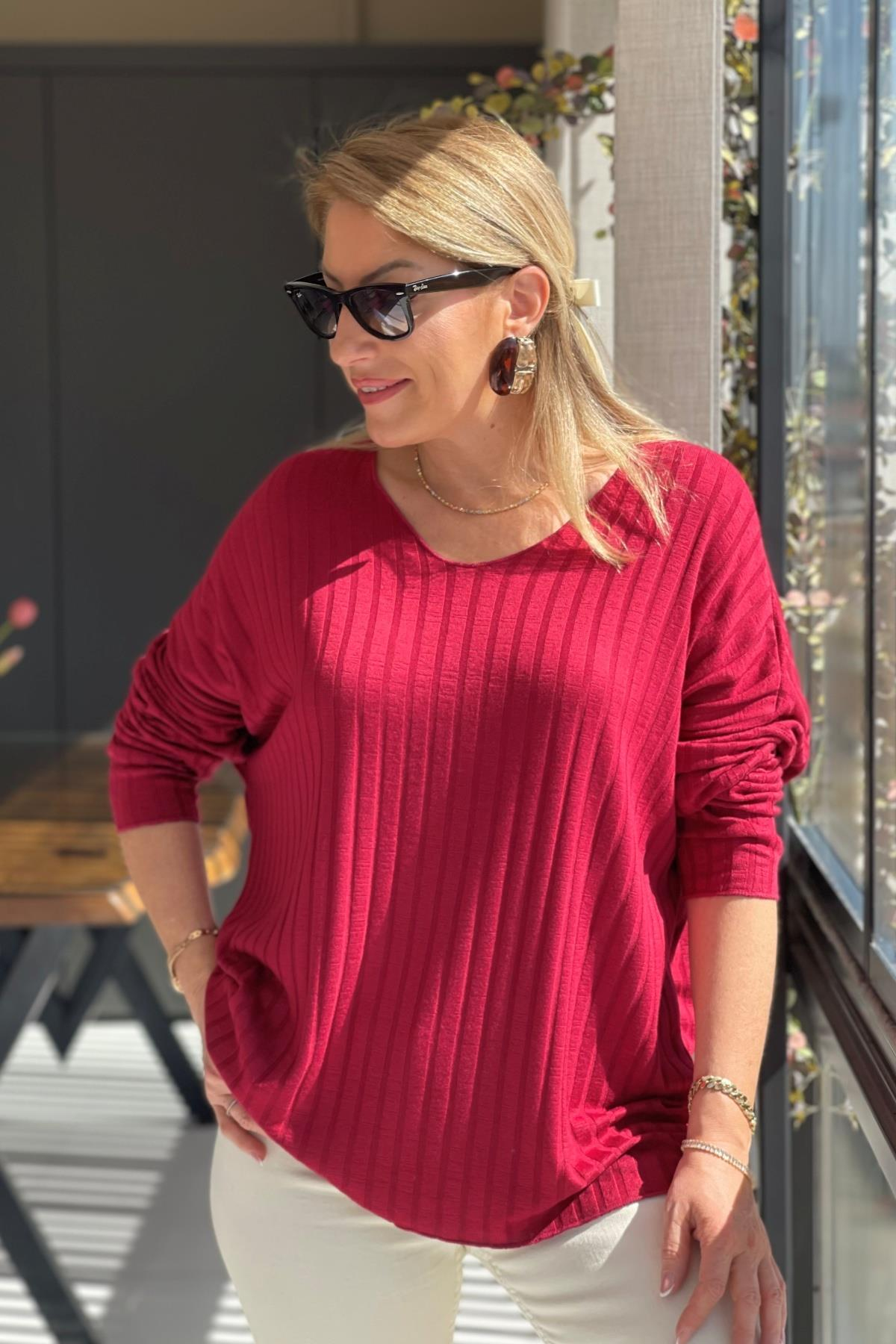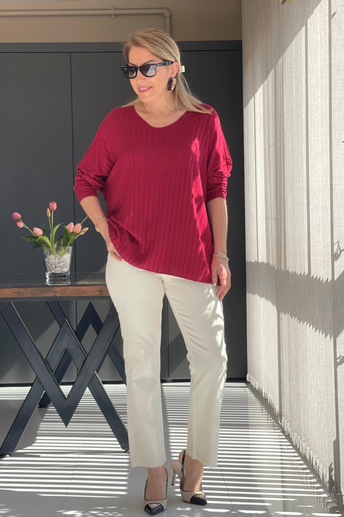 V Yaka İnce Çizgi Bordo Bluz (Mislina-1566)