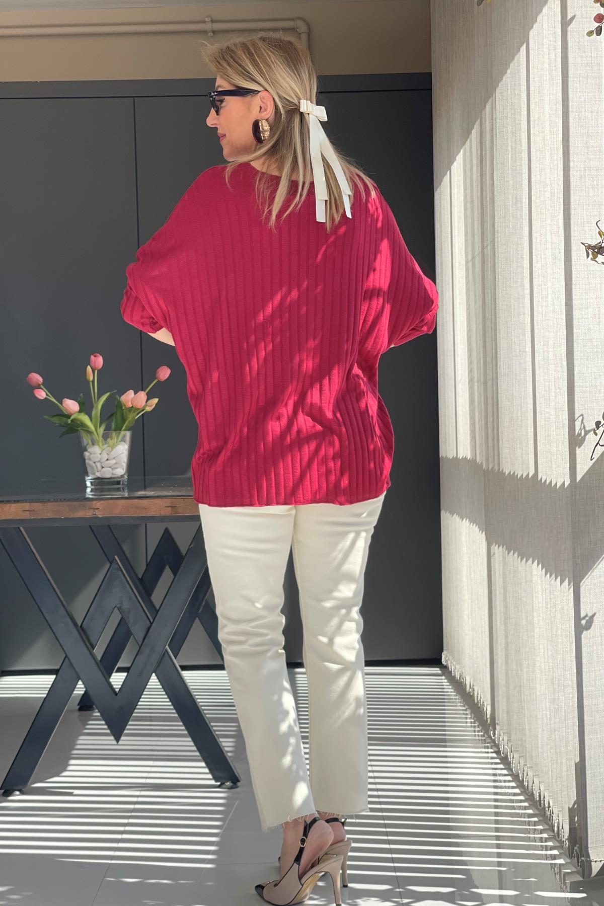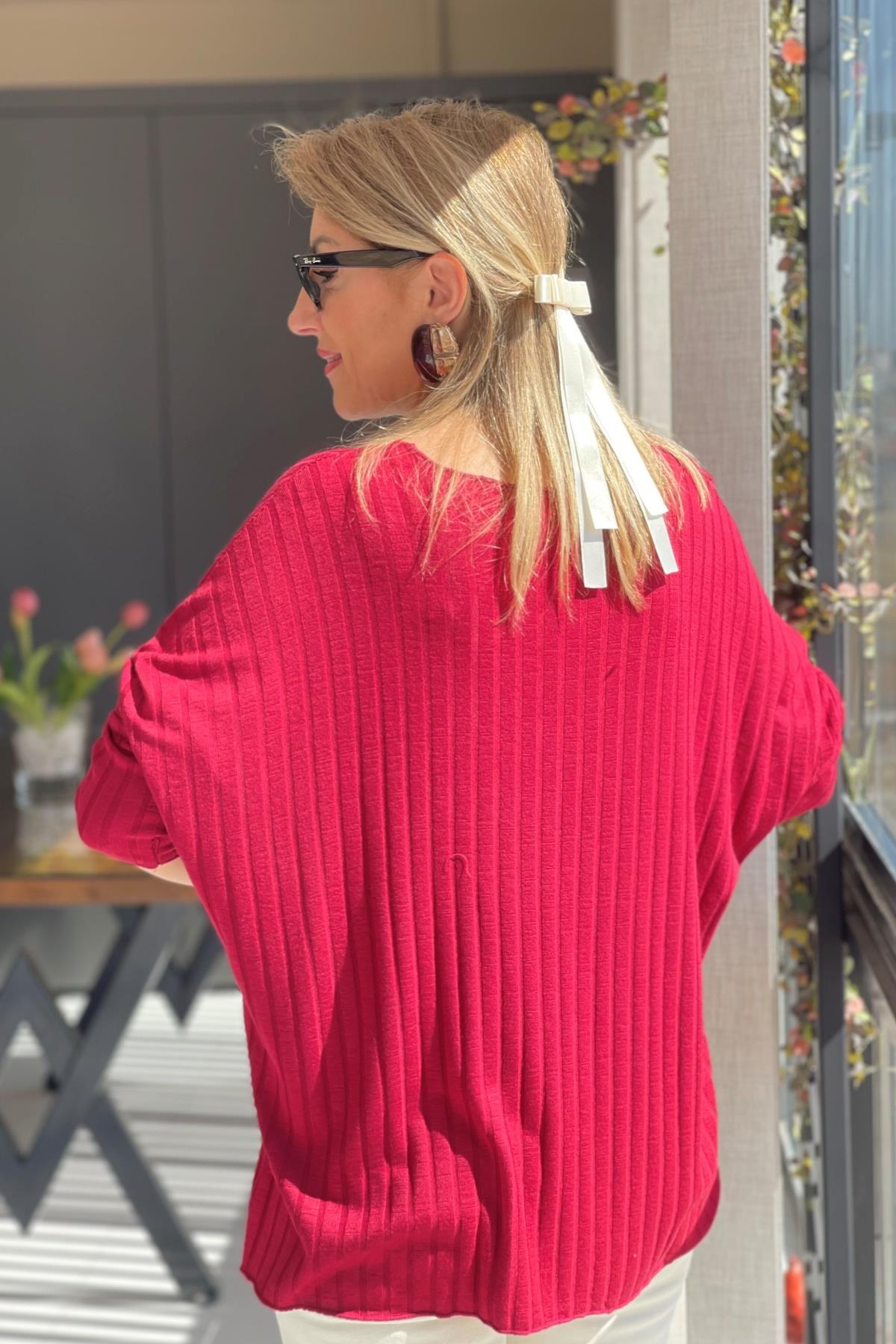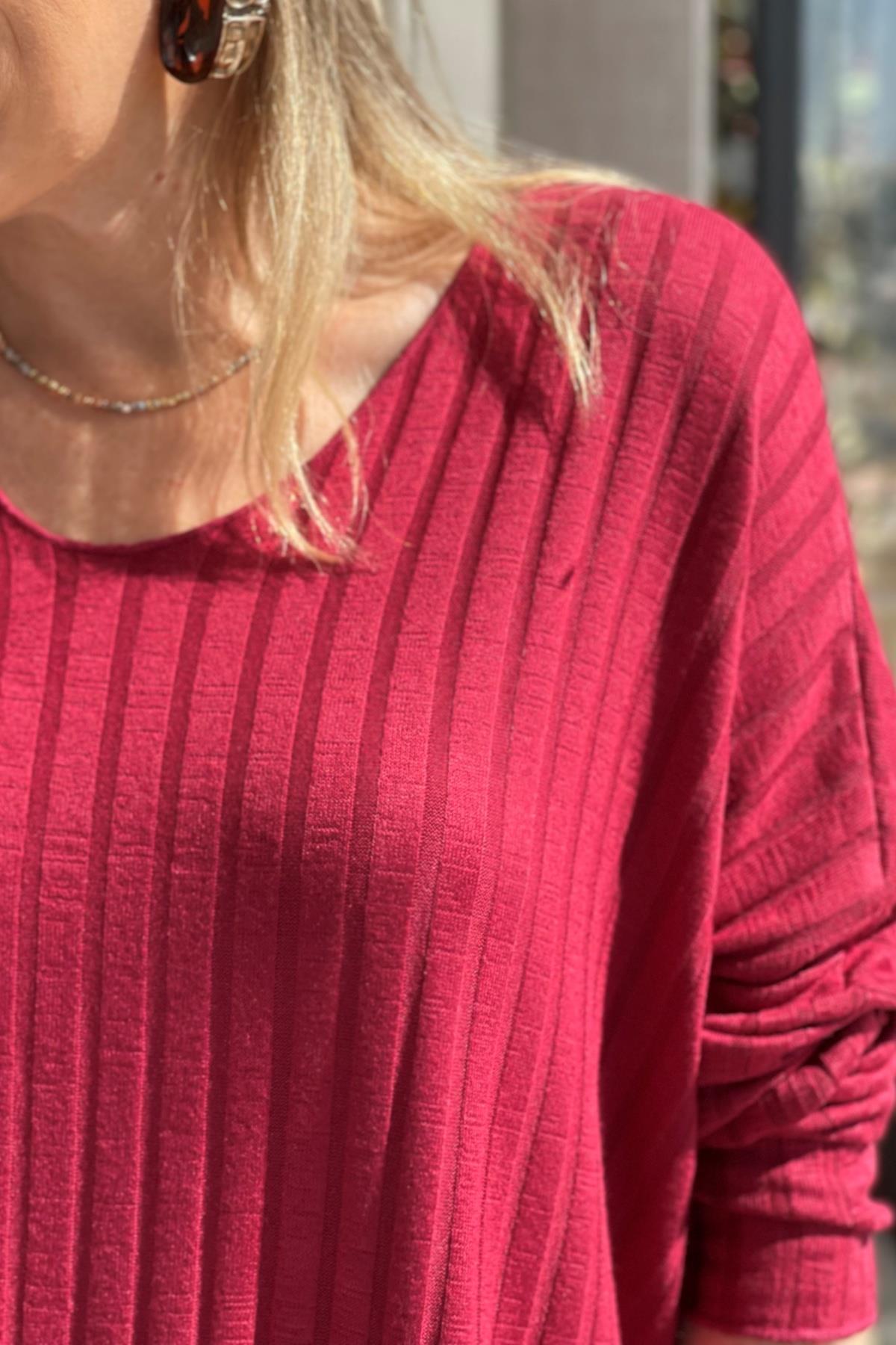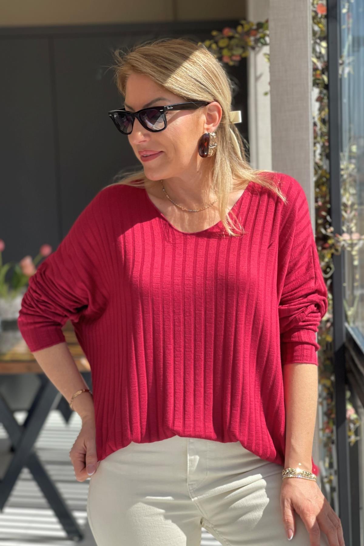 V Yaka İnce Çizgi Bordo Bluz (Mislina-1566)