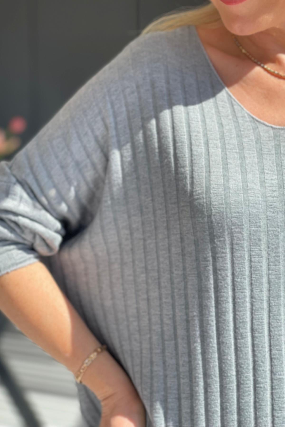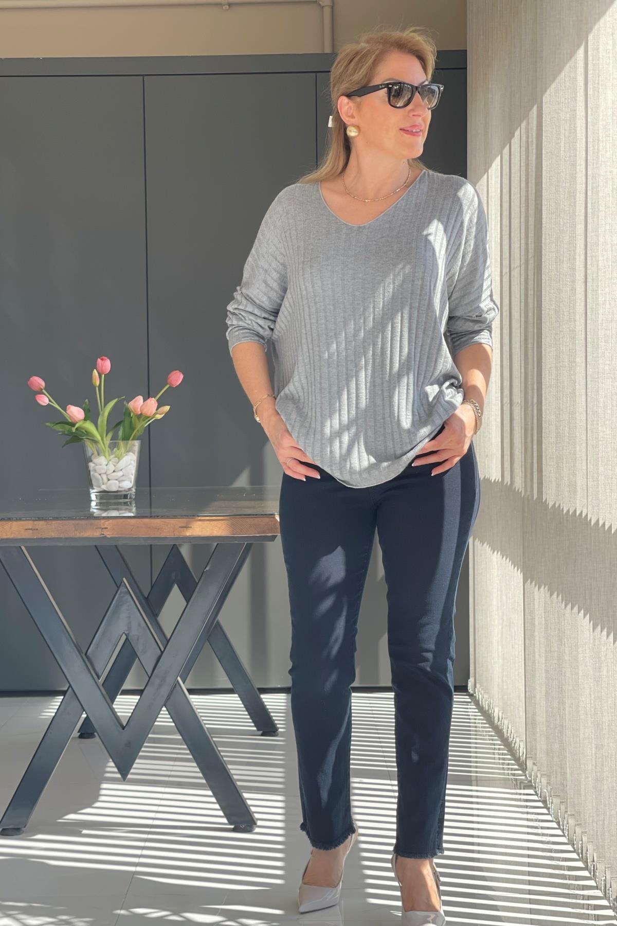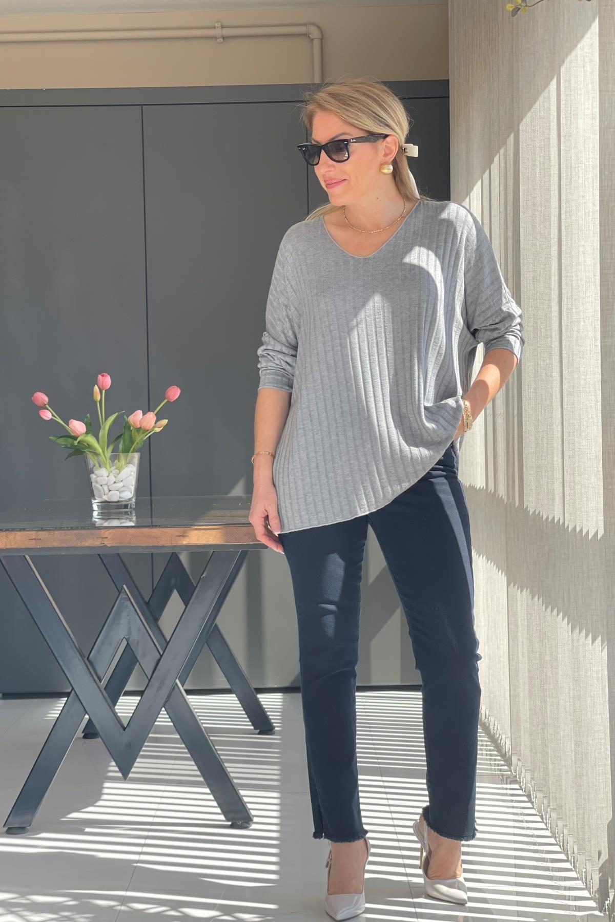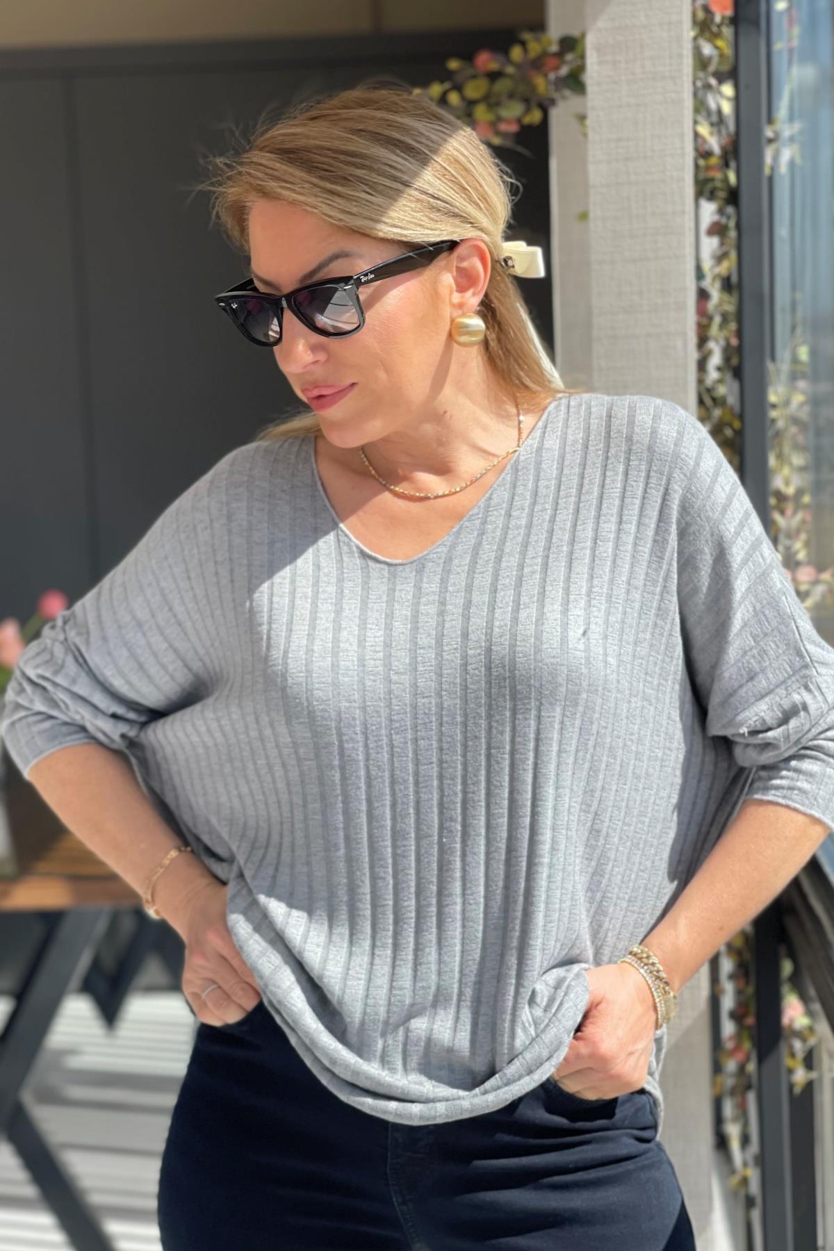 V Yaka İnce Çizgi Gri Bluz (Mislina-1566)
