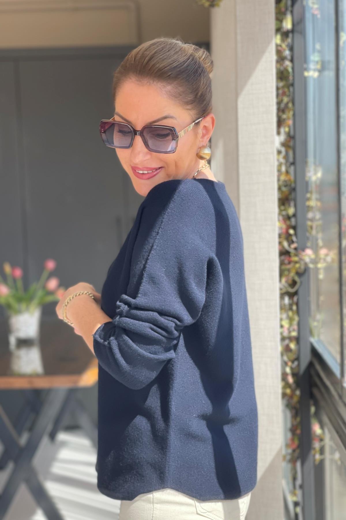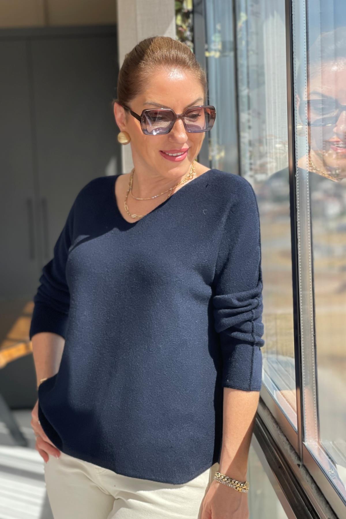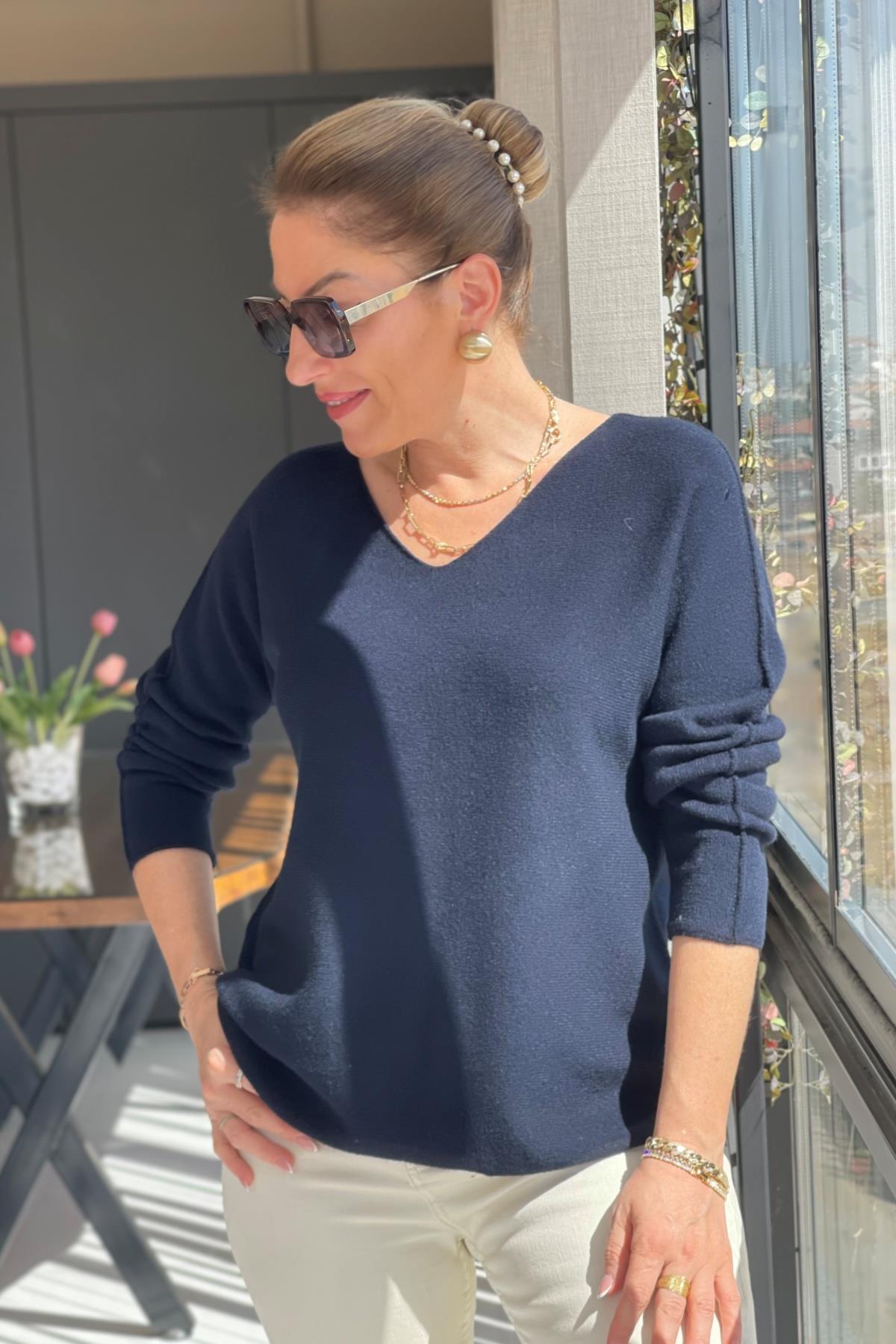 V Yaka Lacivert Triko Kazak (Mislina-1587)