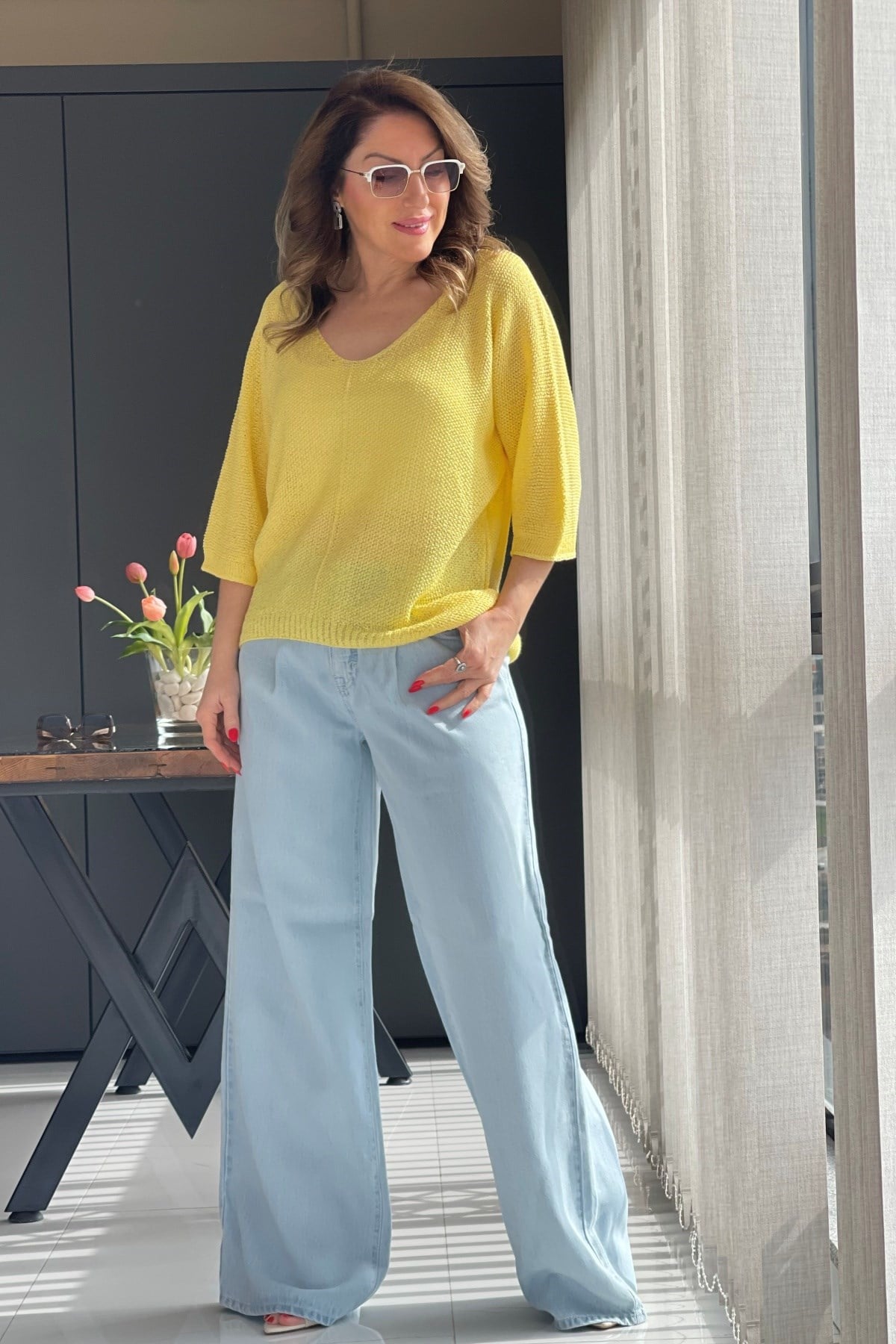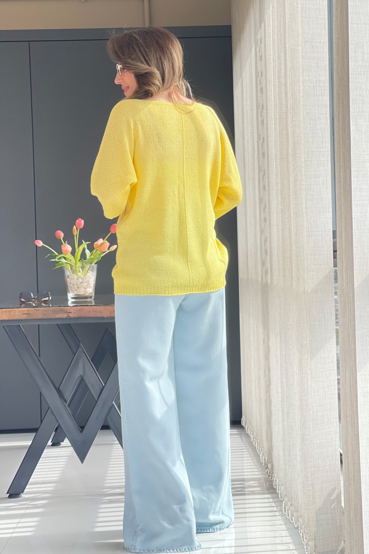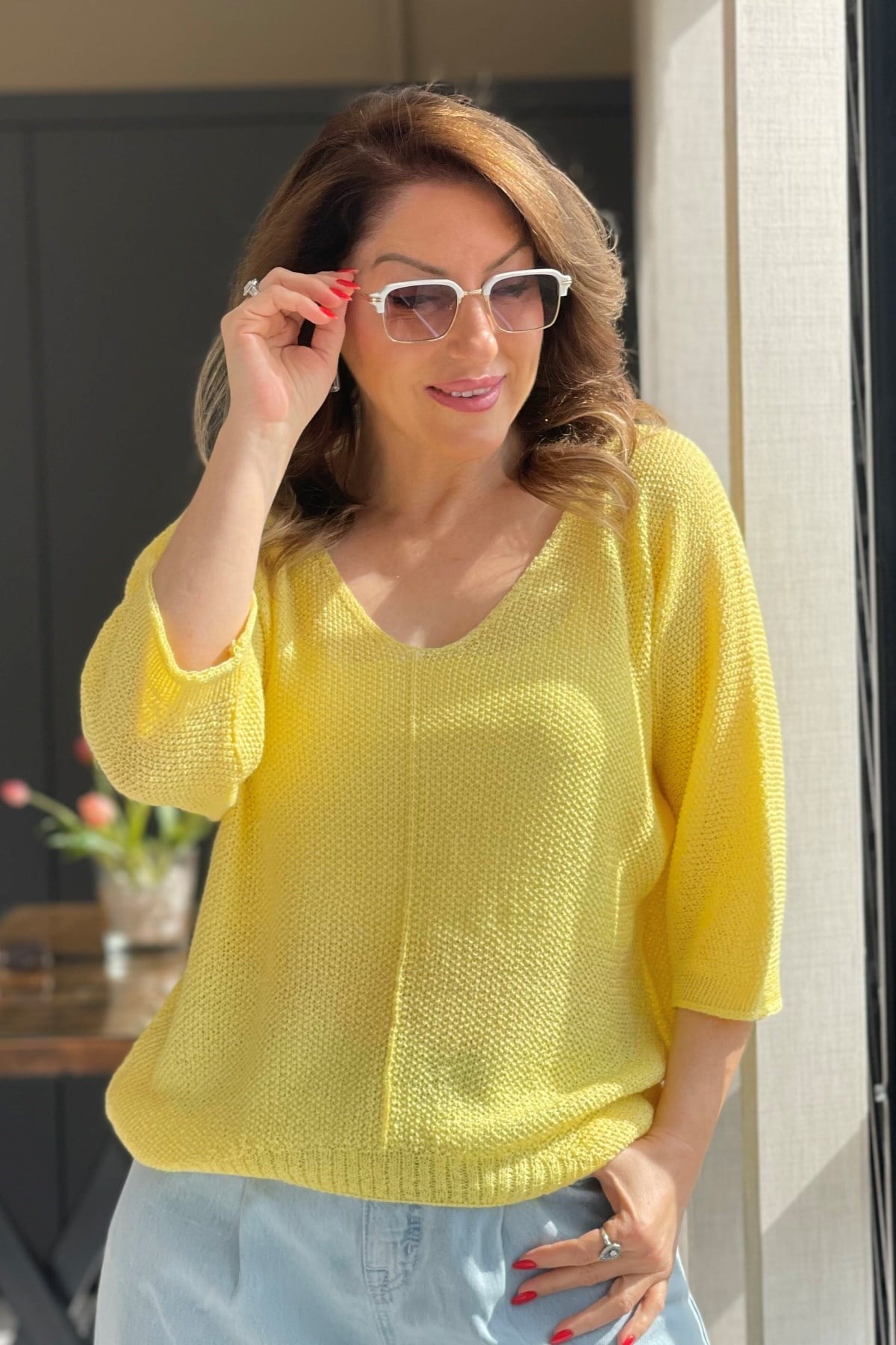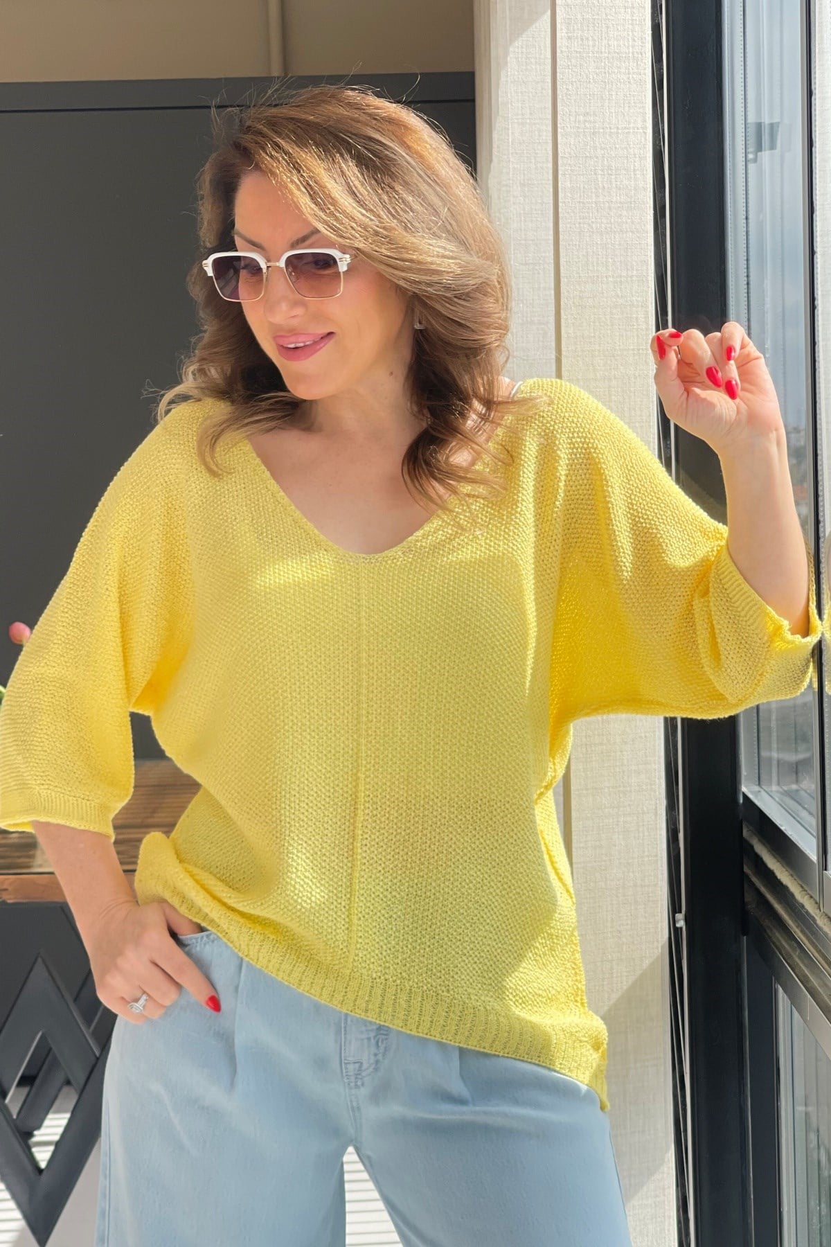 V Yaka Sarı Triko Bluz (Mislina-1854)
