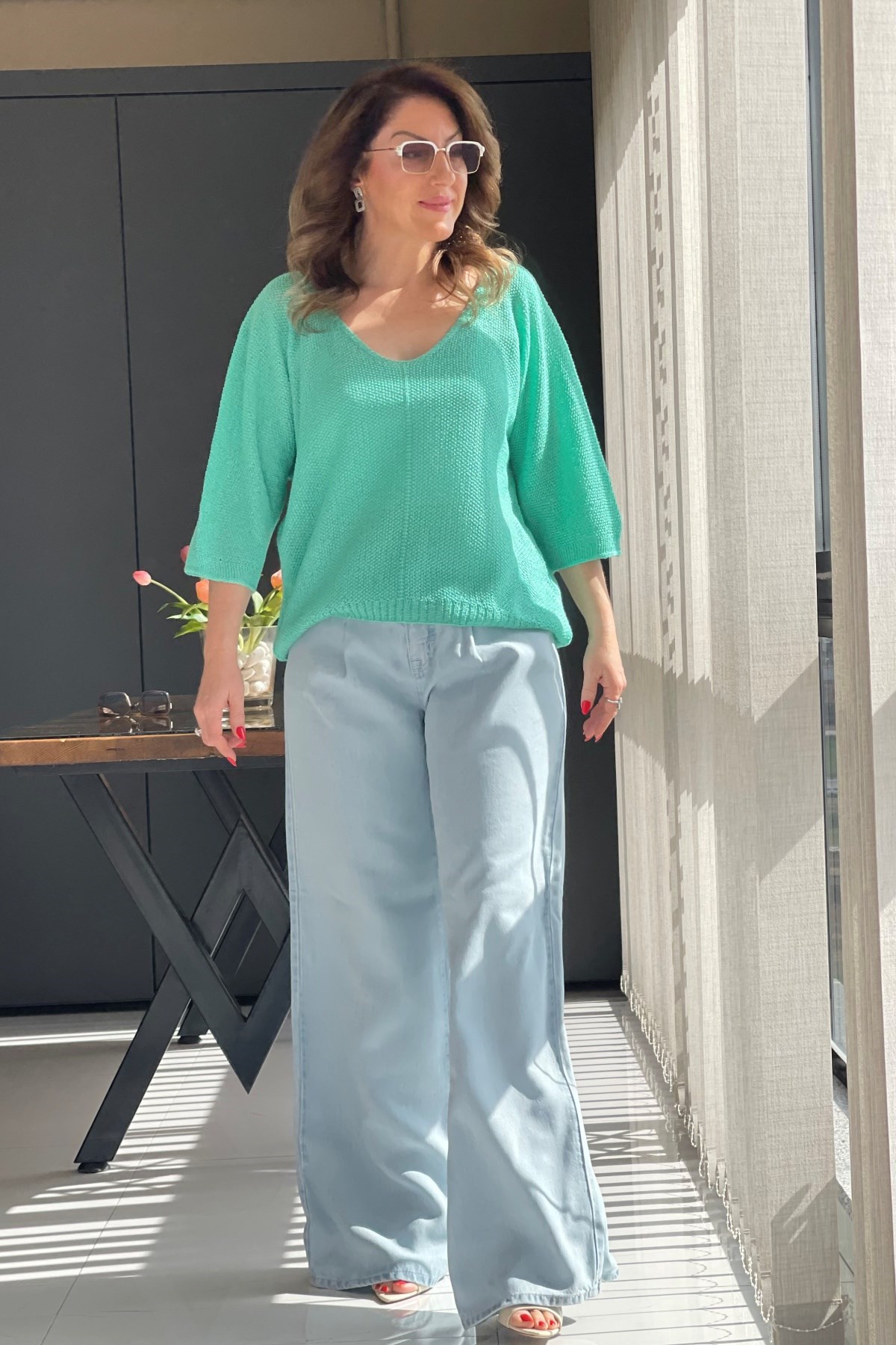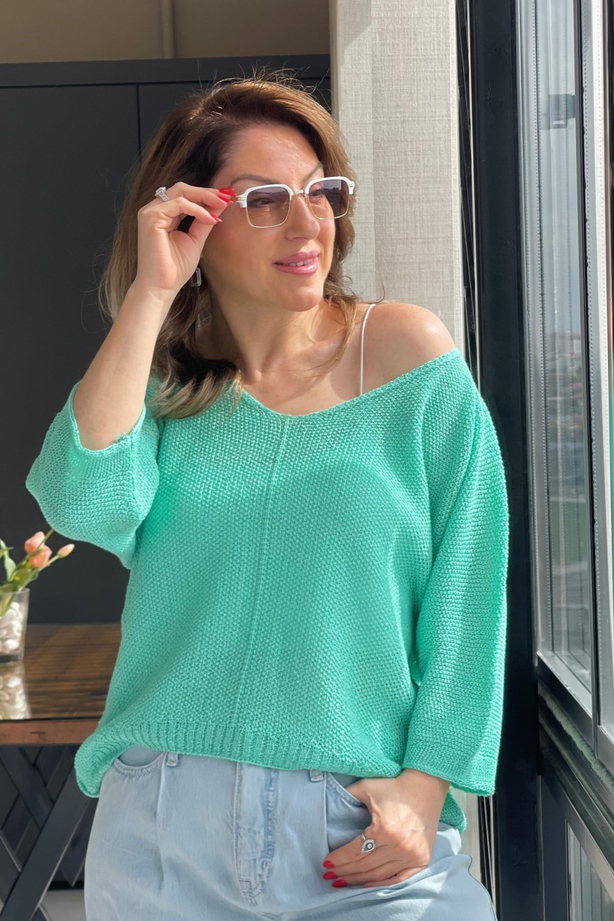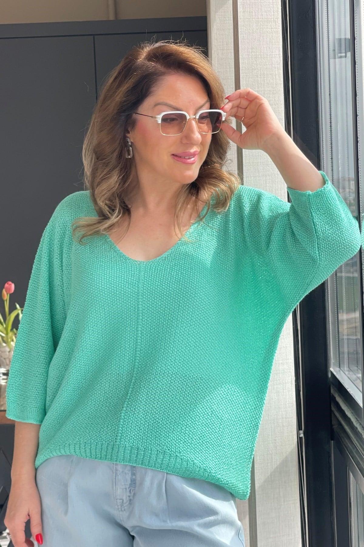 V Yaka Su Yeşili Triko Bluz (Mislina-1854)