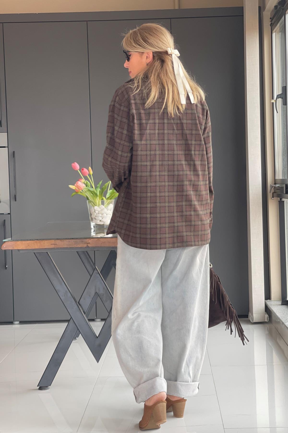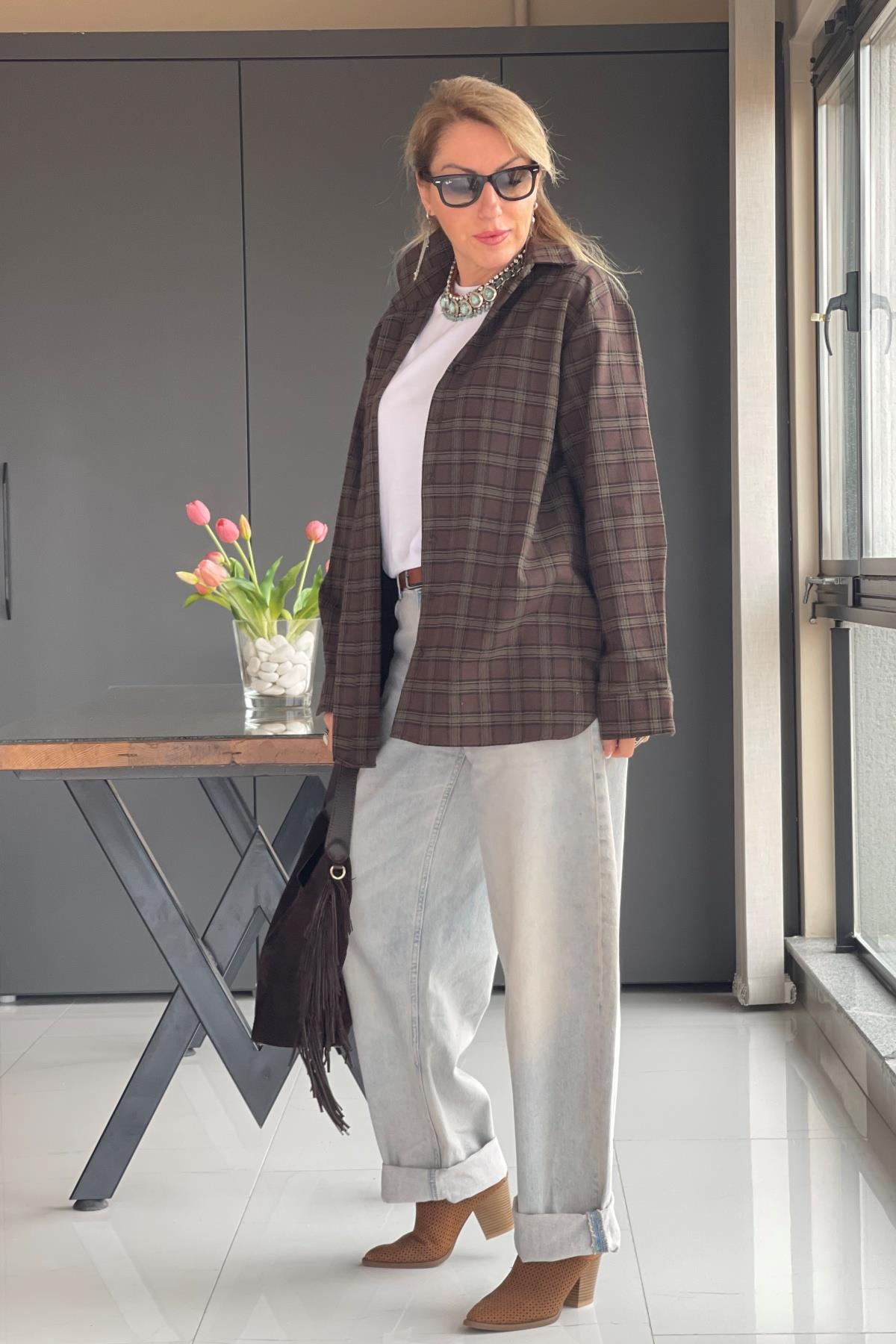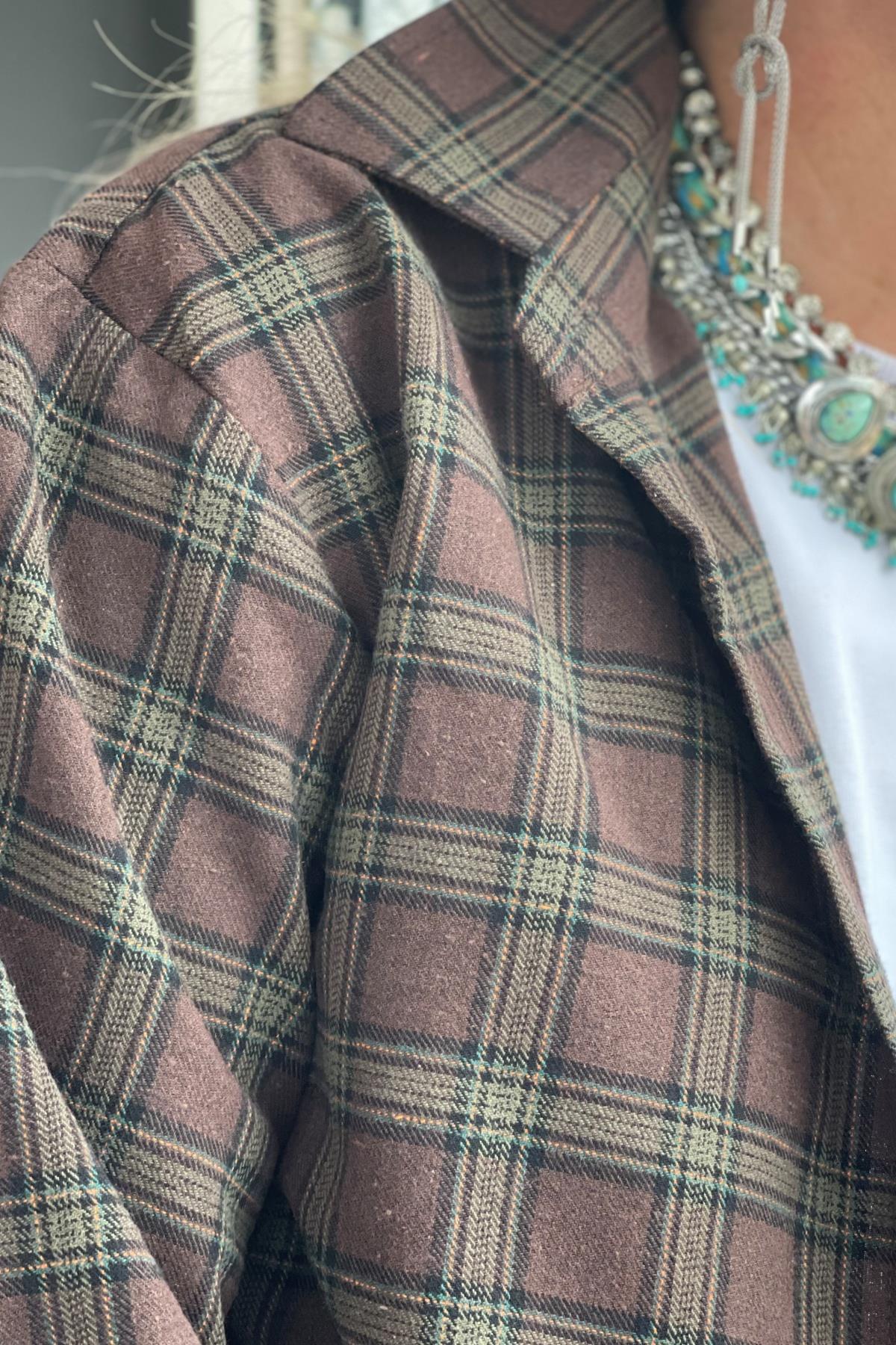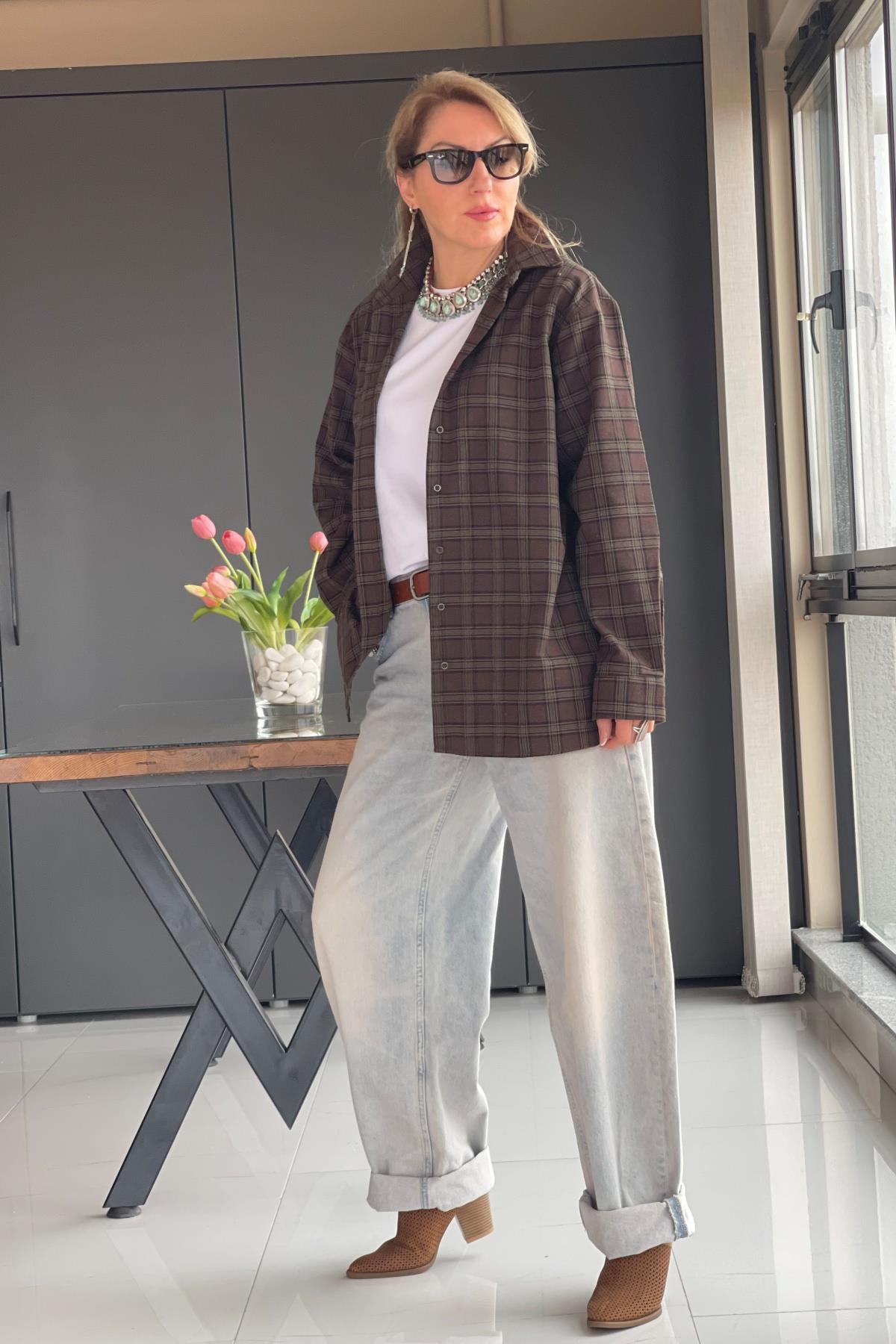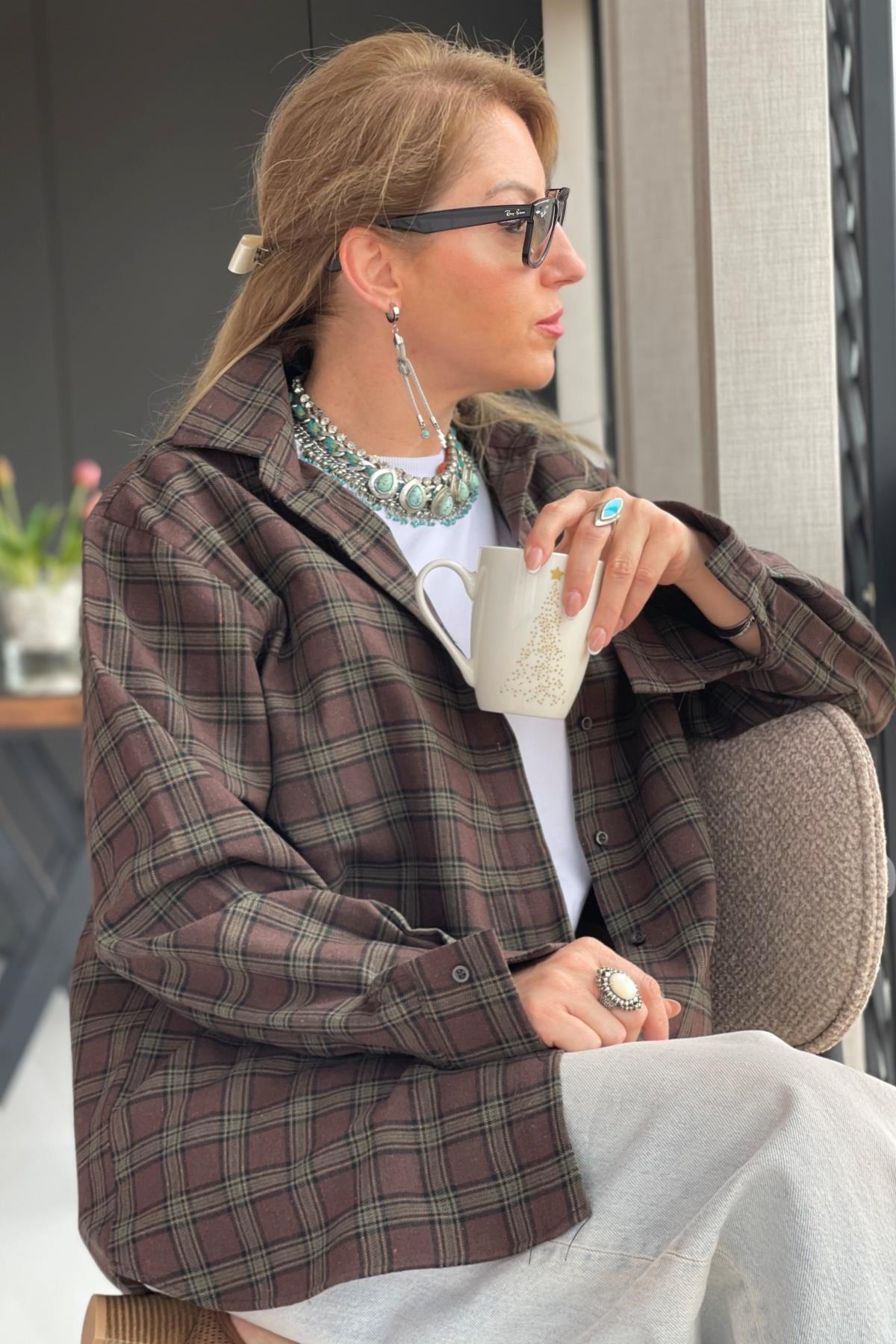 Yeşil Çizgi Detay Kahve Kareli Gömlek (Mislina-1614)