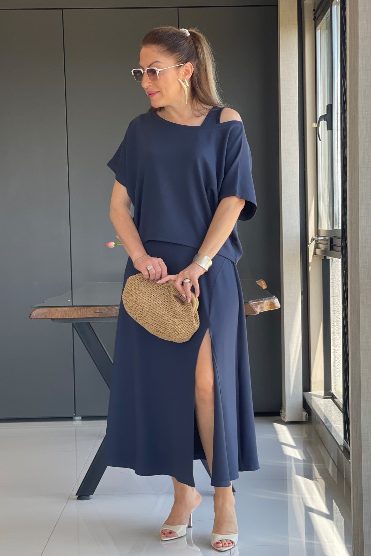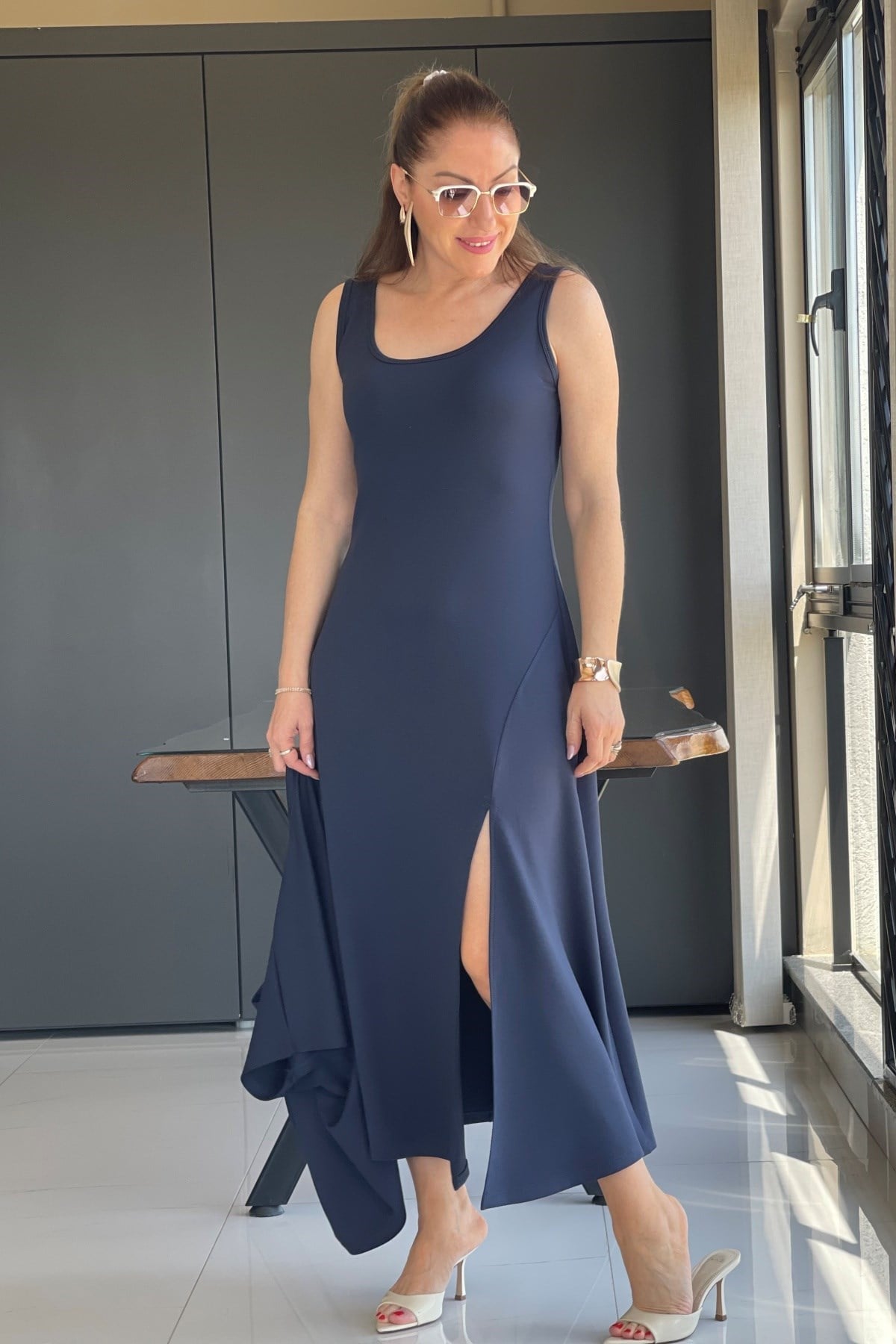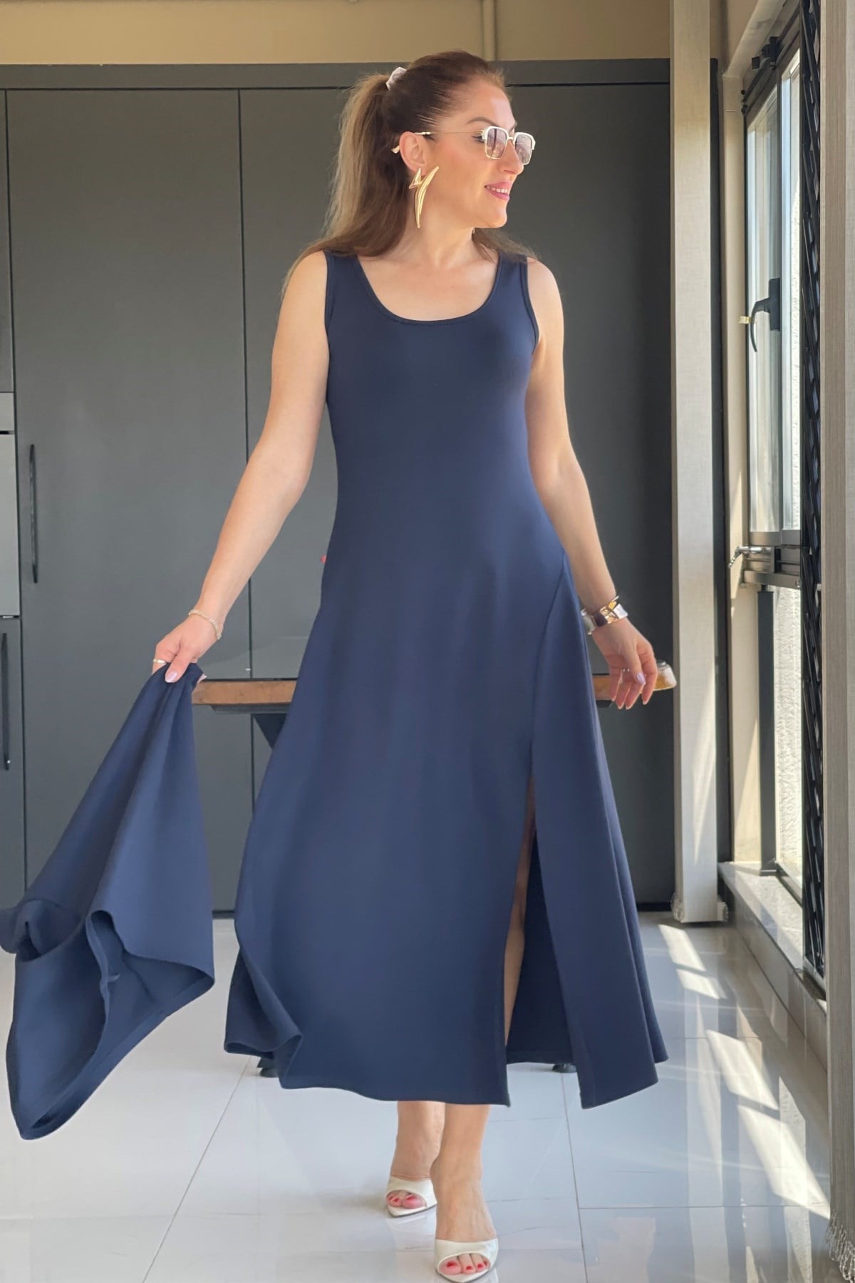 Yırtmaç Detay Lacivert Modal Elbise (Mislina-1888)